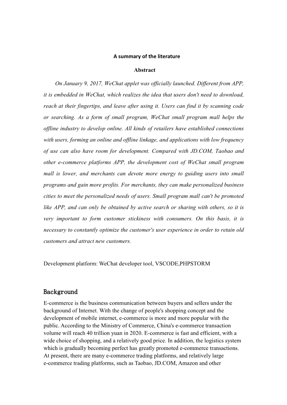 E-commerce is the business communication between buyers and sellers under the background of Internet. With the change of peoples shopping concept and the development of mobile internet, e-commerce is more and more popular with the public. According to the Ministry of Commerce, Chinas e-commerce transaction volume will reach 40 trillion yuan in 2020. E-commerce is fast and efficient, with a wide choice of shopping, and a relatively good price. In addition, the logistics system which is gradually becoming perfect has greatly promoted e-commerce transactions. At present, there are many e-commerce trading platforms, and relatively large e-commerce trading platforms, such as Taobao, JD.COM, Amazon and other platforms, are mainly businesses facing customers, equivalent to department stores; Some e-commerce platforms are mainly engaged in one or several types of products, such as Dangdangs main books; Some electronic sub-business platforms are mainly engaged in the companys products. At present, similar e-commerce platforms can basically be found in various industries. From the perspective of technology implementation, e-commerce platforms include Web site platform, mobile APP application and the latest WeChat applet. The Web site platform is more suitable for PC operation such as computers, and the mobile APP application is suitable for intelligent terminal operation. These two forms occupy the main stream position in the e-commerce trading platform, but with the launch of WeChat applet application in 2017, because of its advantages of simple operation, clear flow process, no need to install, and no occupation of system space, they are gradually loved by users. The purpose is to develop an e-commerce platform for selling fruits and vegetables based on WeChat, which can effectively promote related products and increase farmers income in rural areas with relatively low informatization popularity.