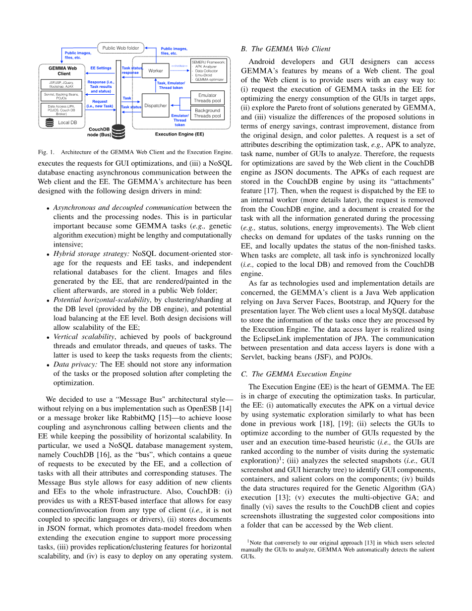 在我们的原始研究论文[13]中,该方法被实现为基于Java程序和脚本的基于命令行的管道,该管道在单线程模式下工作。 因此,我们将GEMMA描述为一种分布式的,基于云的体系结构,该体系结构由(i)Web客户端组成,用户可以从Web客户端上传带有需要优化的屏幕的应用程序;(ii)处理其中包含APK的节点。分析后,这些应用将通过系统的探索在一组仿真器上执行,并使用GEMMA的方法对屏幕进行优化; (iii)支持客户端与处理节点之间异步通信的NoSQL引擎。 值得注意的是,GEMMA的体系结构旨在实现水平可伸缩性,并且可以复制处理节点。