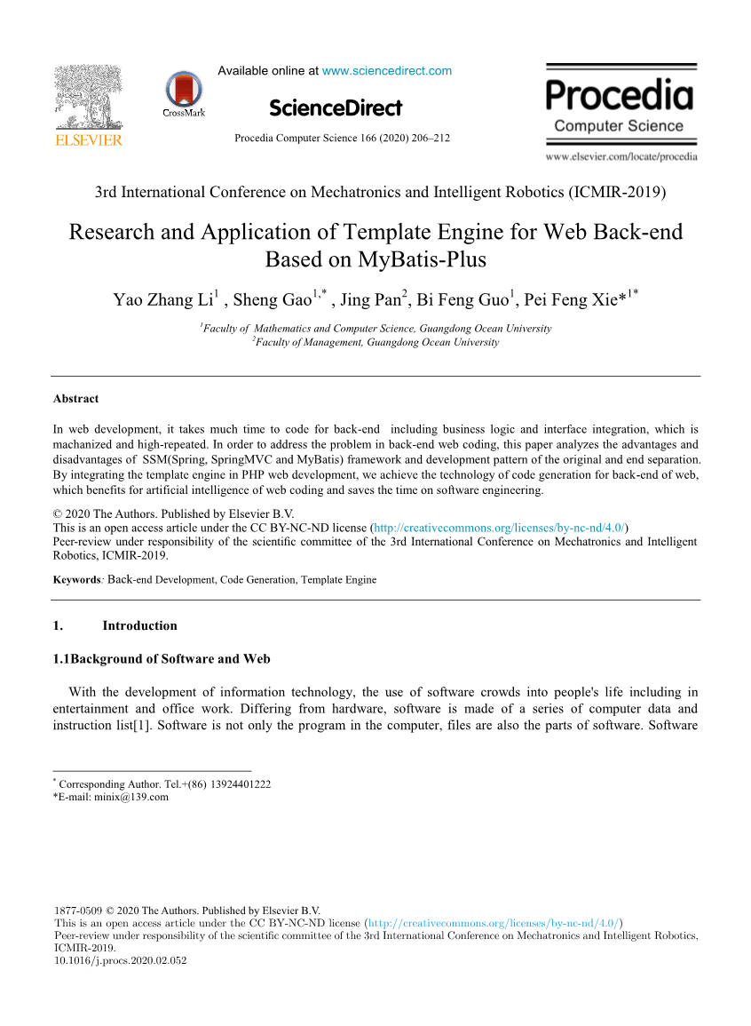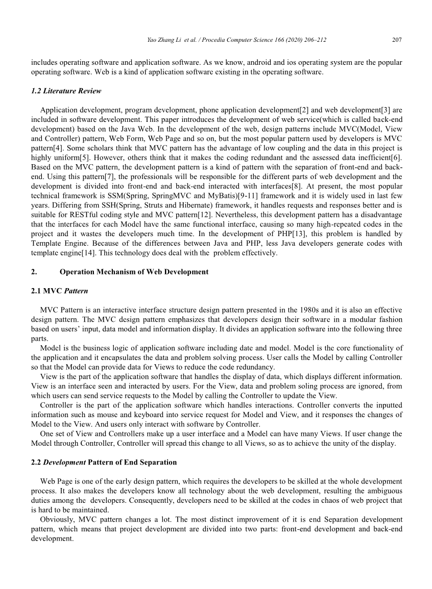 Application development, program development, phone application development[2] and web development[3] are included in software development. This paper introduces the development of web service(which is called back-end development) based on the Java Web. In the development of the web, design patterns include MVC(Model, View and Controller) pattern, Web Form, Web Page and so on, but the most popular pattern used by developers is MVC pattern[4]. Some scholars think that MVC pattern has the advantage of low coupling and the data in this project is highly uniform[5]. However, others think that it makes the coding redundant and the assessed data inefficient[6]. Based on the MVC pattern, the development pattern is a kind of pattern with the separation of front-end and backend. Using this pattern[7], the professionals will be responsible for the different parts of web development and the development is divided into front-end and back-end interacted with interfaces[8]. At present, the most popular technical framework is SSM(Spring, SpringMVC and MyBatis)[9-11] framework and it is widely used in last few years. Differing from SSH(Spring, Struts and Hibernate) framework, it handles requests and responses better and is suitable for RESTful coding style and MVC pattern[12]. Nevertheless, this development pattern has a disadvantage that the interfaces for each Model have the same functional interface, causing so many high-repeated codes in the project and it wastes the developers much time. In the development of PHP[13], this problem is handled by Template Engine. Because of the differences between Java and PHP, less Java developers generate codes with template engine[14]. This technology does deal with the problem effectively.
