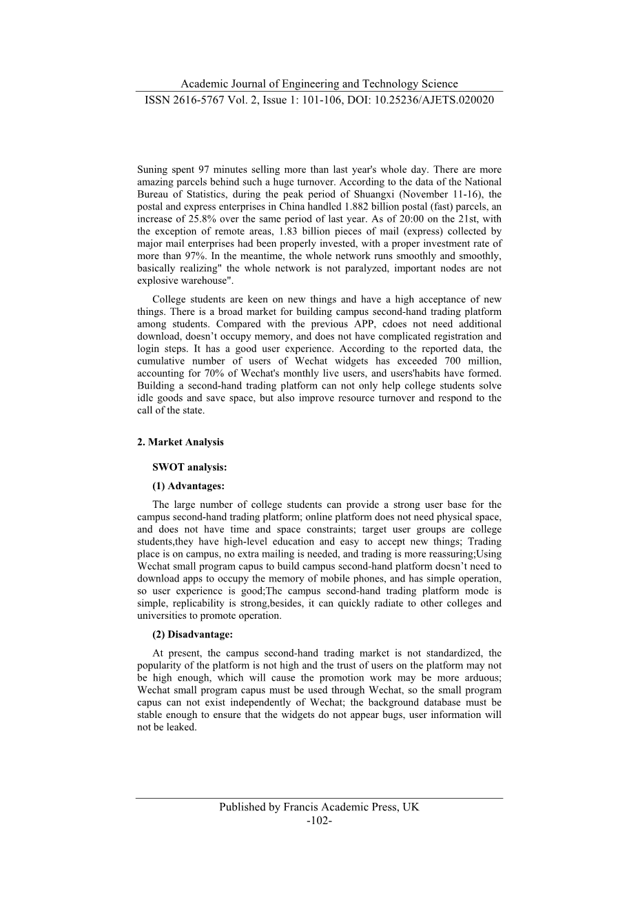 大量的学生可以为校园二手交易平台提供强大的用户基础;在线平台不需要物理空间,并且没有时间和空间的限制;目标用户群是大学生,他们受过高等教育,并且容易接受新事物;交易场所在校园内,不需要额外的邮件,交易更加放心;使用微信小程序筹集资金建立校园二手交易平台,无需下载应用程序即可使用,不占用手机内存,操作简单,因此,用户体验良好;校园二手交易平台模式简单,可复制性强,并且可以迅速辐射到其他高校促进运营。
