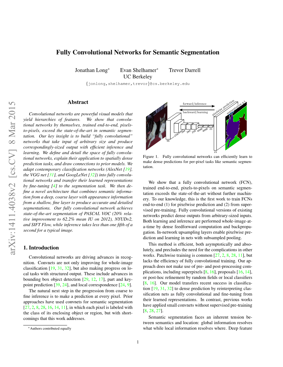 卷积网络在特征分层领域是非常强大的视觉模型。我们证明了经过端到端、像素到像素训练的卷积网络超过语义分割中最先进的技术。我们的核心观点是建立“全卷积”网络,输入任意尺寸,经过有效的推理和学习产生相应尺寸的输出。我们定义并指定全卷积网络的空间,解释它们在空间范围内dense prediction任务(预测每个像素所属的类别,直译是稠密预测,但是这个词多次被引用,就保留这对词组)并联系先前的模型。我们改编当前的分类网络(AlexNet ,the VGG net , and GoogLeNet )到完全卷积网络和通过微调传递它们的学习表现到分割任务中。然后我们定义了一个跳跃式的架构,结合来自深层的粗糙语义信息和来自浅层的详细信息来产生准确和精细的分割。我们的全卷积网络成为了在PASCAL VOC最出色的分割方式(在2012年相对62.2%的平均IU提高了20%),NYUDv2,和SIFT Flow,对一个典型图像推理只需要花费不到0.2秒的时间。