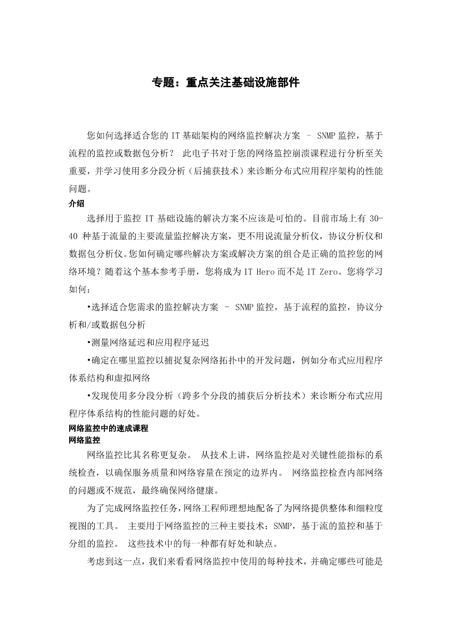 How do you choose a network monitoring solution – SNMP monitoring, flow-based monitoring, or packet analysis – that is appropriate for your IT infrastructure?This ebook is essential for your crash course in network monitoring for analysisand learn to use multi-segment analysis, a post-capture technique, to diagnoseperformance problems with distributed application architectures.