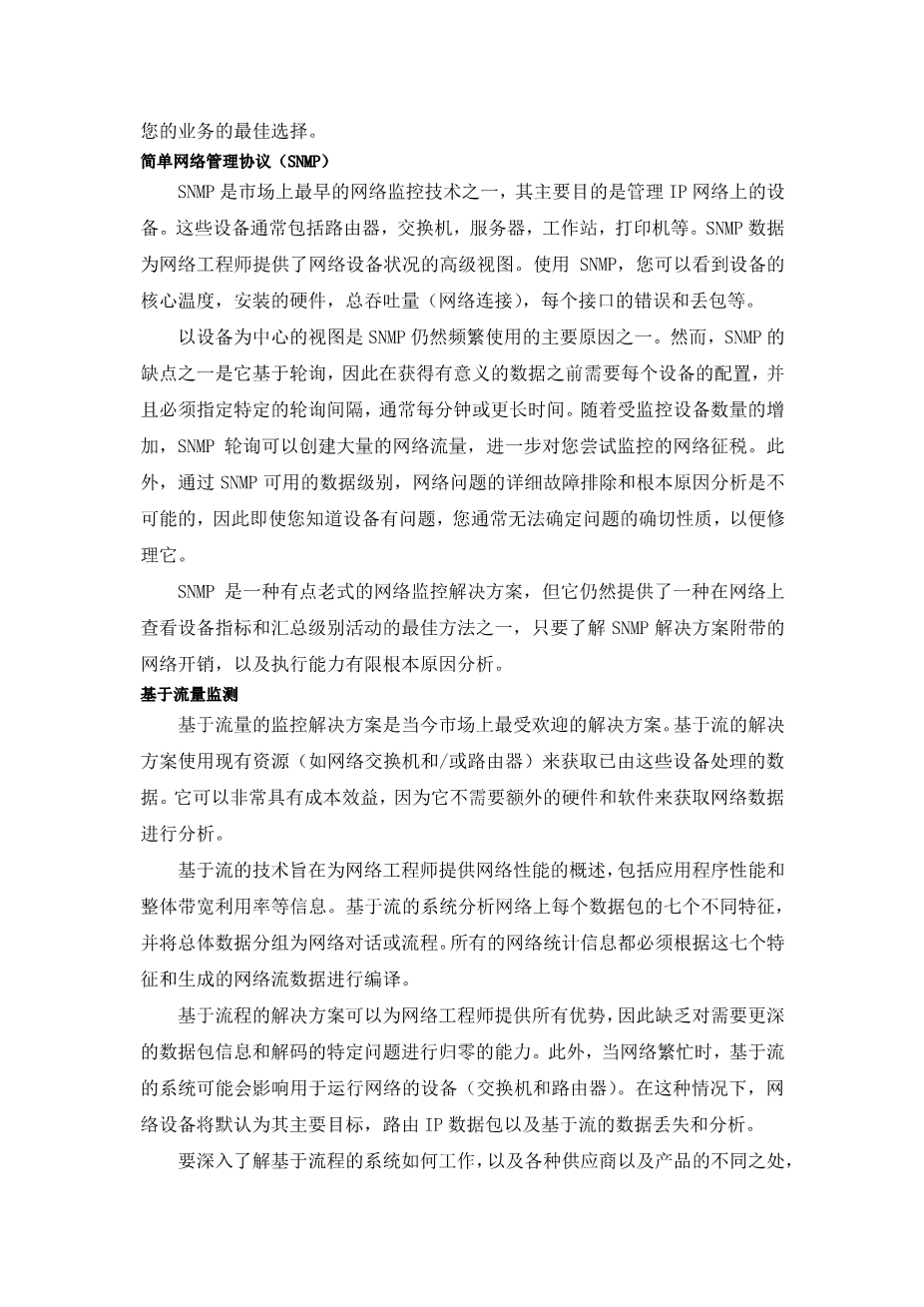 This device-centric view is one of the major reasons why SNMP is still frequently used. However, one of thedrawbacks to SNMP is that it is based on polling, so configuration for each device is required before meaningfuldata can be obtained, and a specific polling interval must be specified, typically every minute, or longer. As thenumber of devices being monitored grows, SNMP polling can create a significant amount of network traffic, furthertaxing the network you are trying to monitor. In addition, detailed troubleshooting and root-cause analysis ofnetwork issues is not possible with the level of data available via SNMP, so even if you know that a device has aproblem, you cannot typically determine the exact nature of the problem in order to fix it.