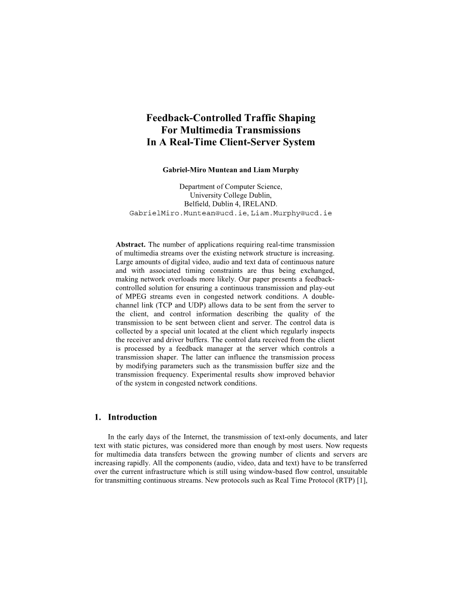 摘要 需要在现有网络结构上实时传输多媒体流的应用程序数量正在增加。大量连续的数字视频、音频和文本数据需要在有限的时间内进行交换,很容易造成网络过载过大。因此,本文提出了一种反馈控制的解决方案,确保即使在拥塞的网络条件下,也能保证MPEG流的连续传输和播放。双通道链路(TCP和UDP)允许数据从服务器发送到客户端,并控制描述在客户端和服务器之间发送的传输质量的信息。控制数据由位于客户端的特殊单元收集,该单元定期检查接收器和驱动器缓冲区。从客户端接收的控制数据由服务器上的反馈管理器处理,该反馈管理器控制传输监管器。后者可以通过修改传输缓冲区大小和传输频率等参数来影响传输过程。实验结果表明,在网络拥塞的情况下,系统的性能得到了改善。