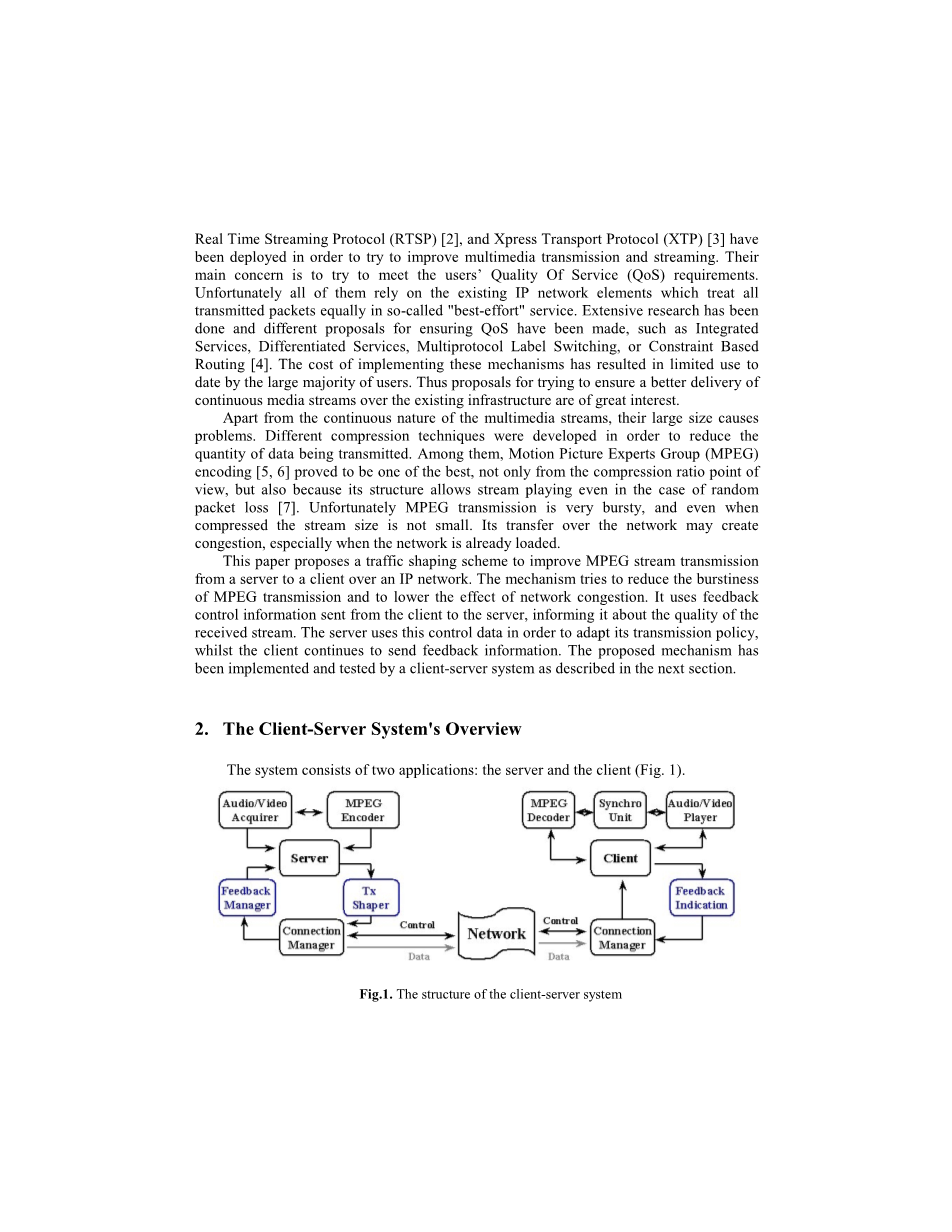 本文提出了一种流量监管方案,以改善MPEG流在IP网络上从服务器到客户端的传输。该机制试图降低MPEG传输的突发性,降低网络拥塞的影响。它使用从客户端发送到服务器的反馈控制信息,通知它所接收流的大小。服务器使用此控制数据以调整其传输策略,同时客户端继续发送反馈信息。如下一节所述,所提出的机制已由客户机-服务器系统实现和测试。