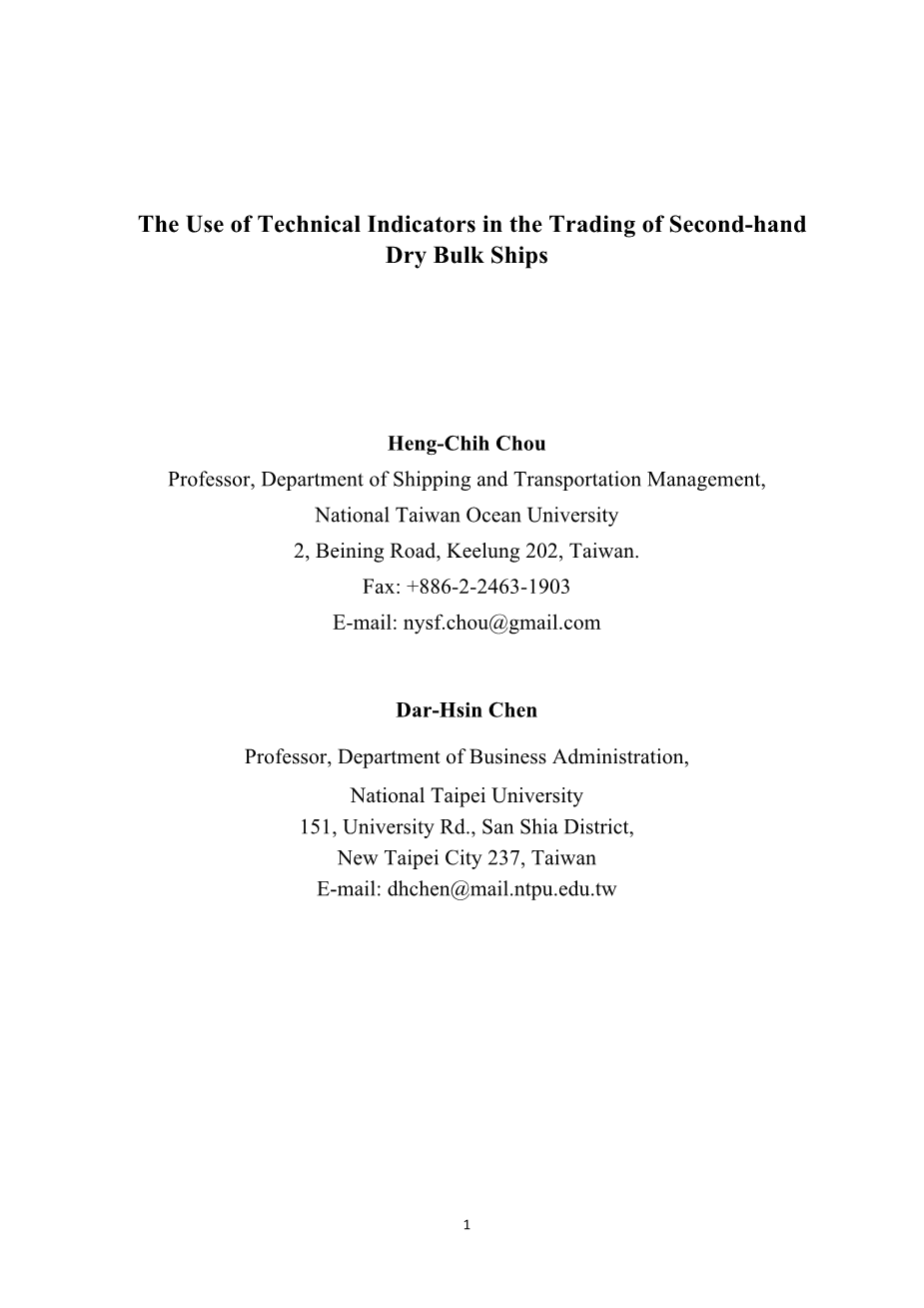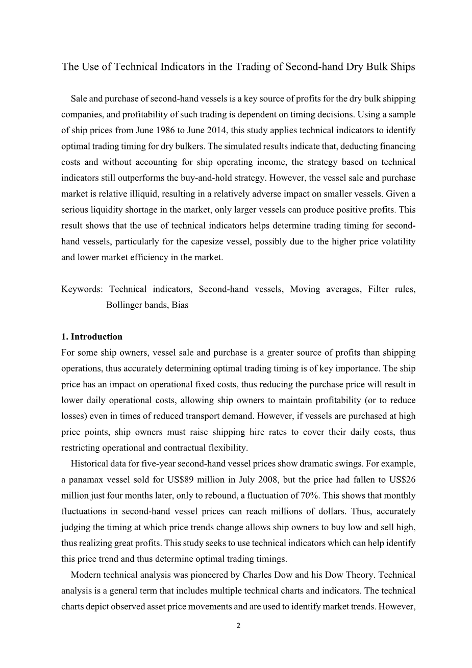 如果技术分析可以应用于船舶买卖,它可能会帮助船东确定一个更好的交易船舶的时机。然而,技术指标在航运业中的应用还处于起步阶段,相关文献还很缺乏。Adland(2000)利用技术指标对油轮价格进行分析,发现利用过滤规则确定最优交易时机可以提高交易绩效,交易成本对利润没有显著影响。Adland和Koekebakker(2004)后来考虑了这种影响,发现技术指标的交易表现几乎总是弱于买入并持有策略,说明技术指标可能不适合于市场流动性不足的二手船舶交易。Alizadeh和Nomikos(2007)综合了技术分析和基本面指标来确定二手干散货船的最佳交易时机,发现结合移动平均线交易信号和市盈率来确定最佳交易时机优于买入并持有策略。Alizadeh和Nomikos(2009)将技术指标应用于巴拿马远期货运协议(panamax Forward Freight Agreements, FFAs)交易,使用了移动平均交叉规则、移动平均线、Bollinger带和相对强度指数。他们的结果表明,移动平均交叉规则有助于提高交易利润。