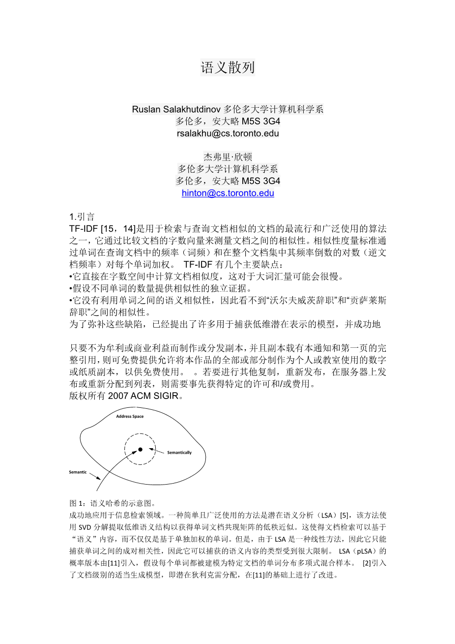In this paper we describe a new retrieval method called “seman- tic hashing” that produces a shortlist of similar documents in a time that is independent of the size of the document collection and linear in the size of the shortlist. Moreover, only a few machine instruc- tions are required per document in the shortlist. Our method must store additional information about every document in the collec- tion, but this additional information is onl