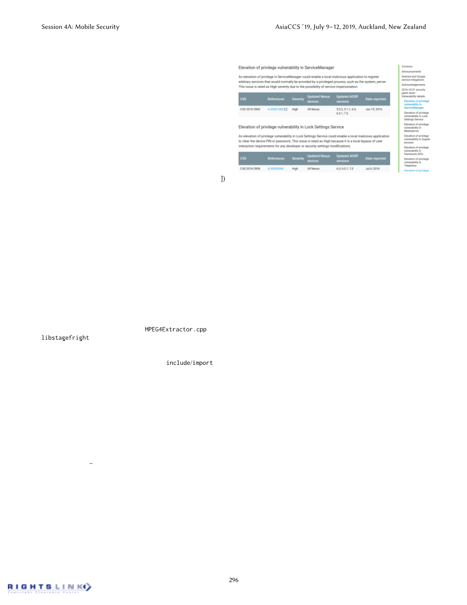 最近出现的漏洞奖励程序为研究人员提供了一个系统地分析漏洞的新来源。例如Finifter等人[29]对脆弱性奖励计划(VRP)进行了首次实证研究使用Chrome和Firefox VRPs,以及Zhao等人。[76]测量了白帽子在Hackerone和Wooyun漏洞平台上提交的漏洞报告。Android也有自己的漏洞奖励程序,称为Android安全公告程序。最近的一项研究[52]利用公告资源分析Android系统漏洞;然而,它仅依靠大量的手工工作来测量660个漏洞的元数据和统计结果。此外,只分析了来自相应CVE(常见漏洞和暴露)报告的文本信息,而没有挖掘补丁。