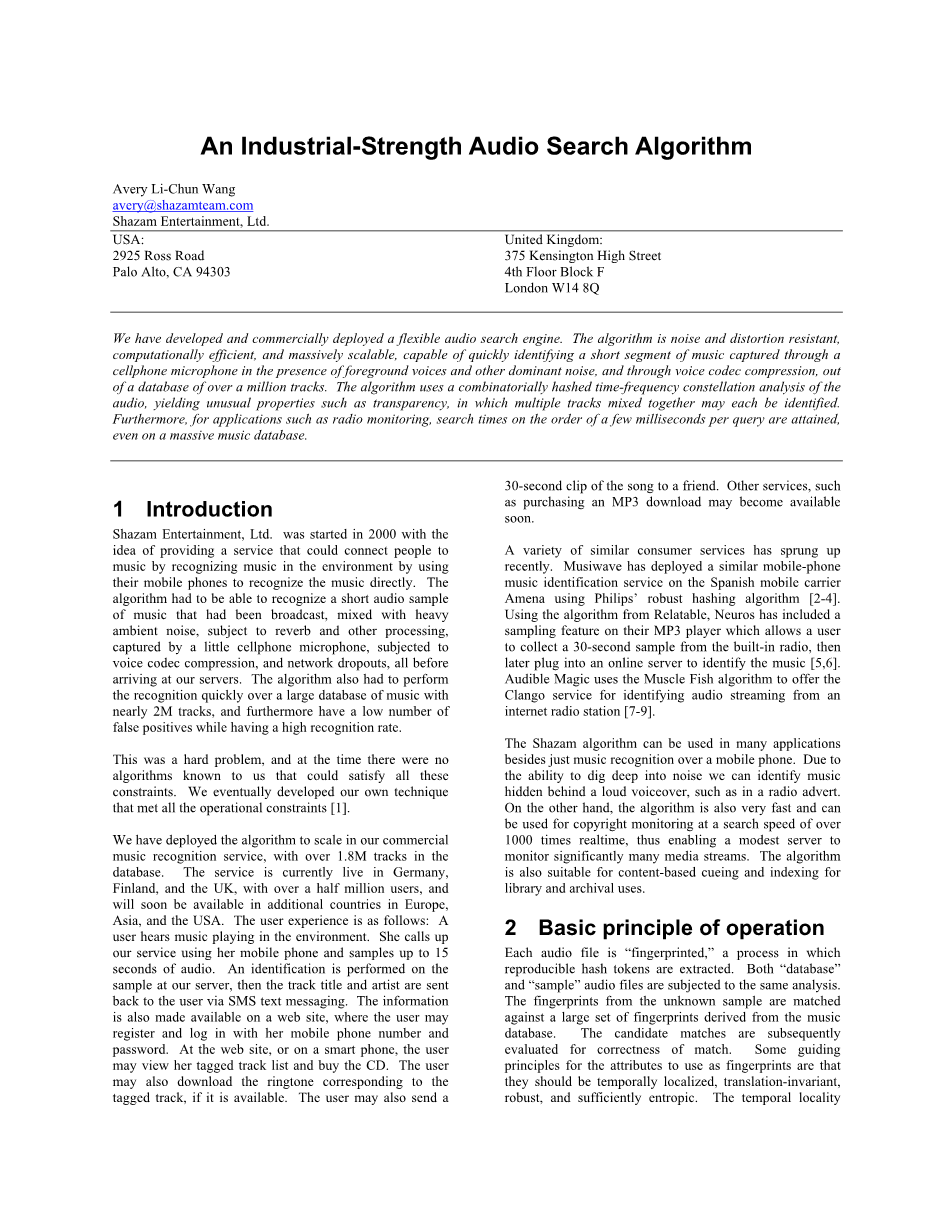 Shazam公司创立于2000年,最初的目的是方便用户通过自己的手机检索正在播放的歌曲。(为了达到很高的可用性,算法必须具有下面几个特性。)算法必须能利用很短的音频片段辨识出正确的歌曲。特别地,即使该音频片段包含很强的噪音和扰动,并且经过各种损害性处理,例如压缩和网络丢包等,算法也需要准确地返回结果。此外,当曲库规模达到200万时算法也需要很快地返回结果。返回的结果在保证高识别率的同时必须具有很低的假阳性(false positive)概率。