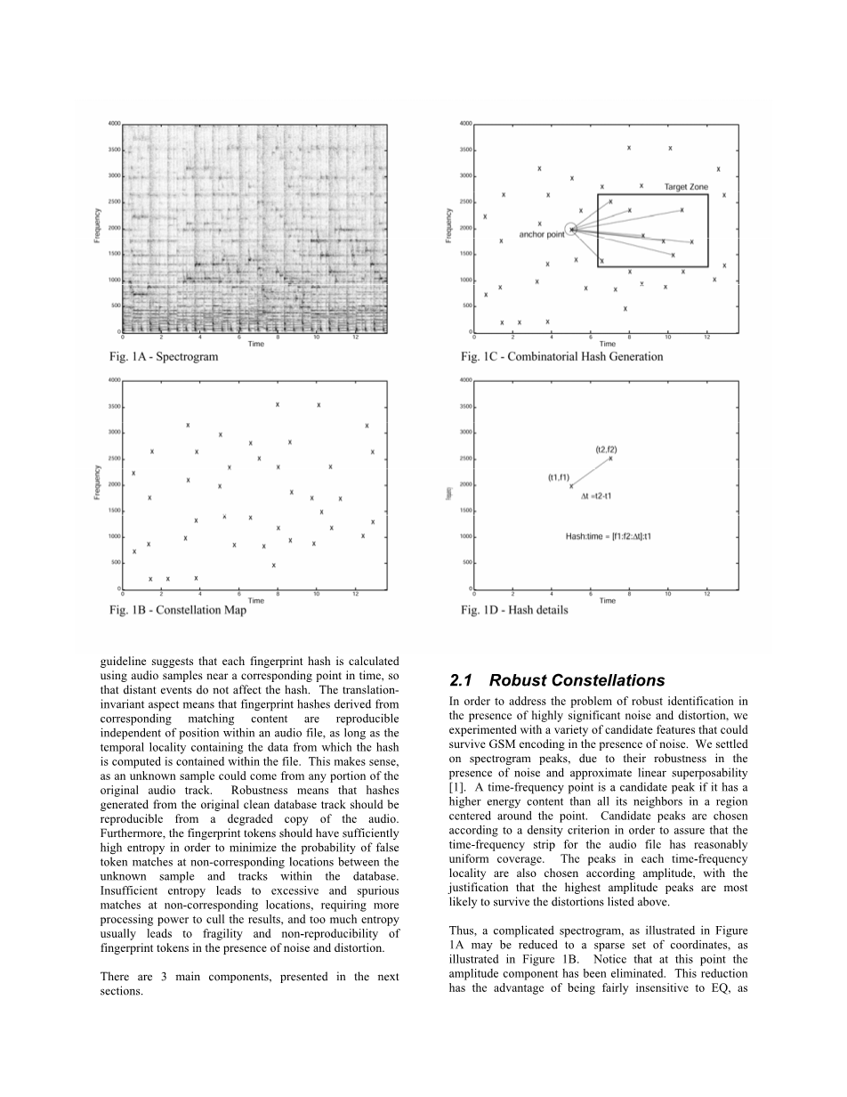 数据库和录制的音频文件都需要提取可复现的哈希“令牌”,也即指纹。从未知音频中提取的指纹需要和音乐库中提取的海量指纹进行匹配。匹配上的指纹会用来衡量匹配的正确性。提取的指纹需要满足几个指导性原则:时间局部性(temporally localized),转换不变性(translation-invariant),鲁棒性(robust)和指纹信息量大(sufficiently entropic)。时间局部性表示指纹是由时间上接近的音频数据构造的,这样较远时刻的事件不会对该指纹产生影响(如果指纹是由时刻相距较远的音频数据构造的,则指纹会很不稳定,易受到外界噪音干扰)。转换不变性表示提取的指纹必须和位置无关,并且是可复现的。这是因为用户录音可以从任意位置开始。鲁棒性表示从“干净”音乐中提取的指纹也必须可以从含有各种噪音的音频中复现。此外,指纹也必须要包含足够的信息以便减少错误位置的无用匹配。指纹包含的信息量过少通常会导致冗余繁琐的匹配,从而浪费大量计算资源。但是,如果指纹包含的信息量过多又会导致指纹的脆弱性,使指纹在噪音和失真环境下不能复现。