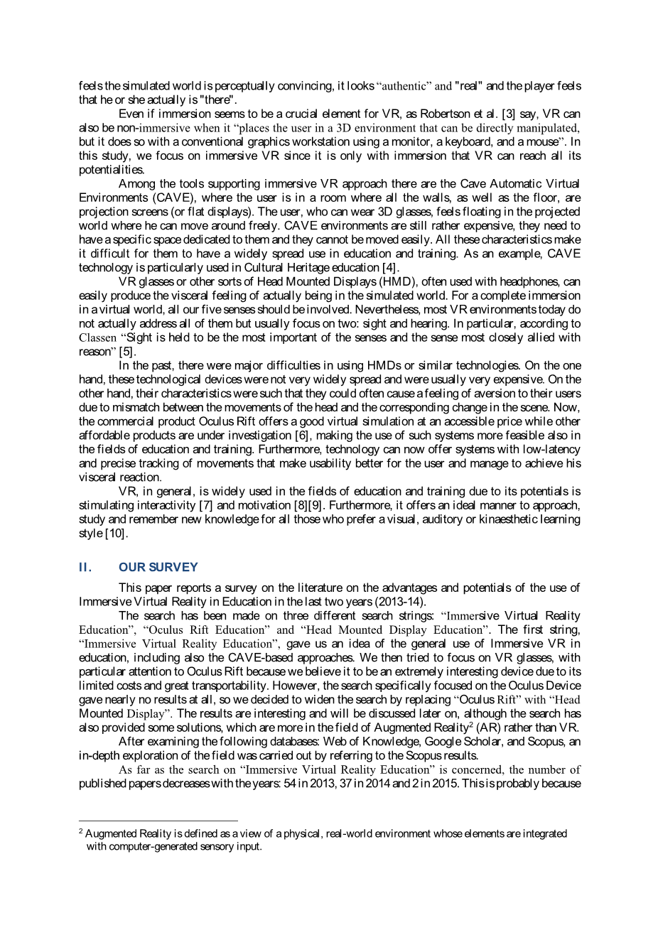 本文针对过去两年(2013-14年)在教育中使用沉浸式虚拟现实的优势和潜力进行了文献调查。调查使用了三种不同的搜索字符串:“沉浸式虚拟现实教育”,“OculusRift教育”和“头戴式显示器教育”。第一个字符串“沉浸式虚拟现实教育”使我们对沉浸式VR在教育中的普遍使用有了一个想法,包括基于CAVE的方法。然后,我们尝试着眼于VR眼镜,尤其要关注OculusRift,因为我们认为它是一款非常有趣的设备,因为它的价格有限且具有很好的可移植性。但是,专门针对Oculus设备的检索几乎没有结果,因此我们决定通过将“OculusRift”替换为“HeadMountedDisplay”来扩大检索范围。尽管该搜索还提供了一些解决方案,但其结果更有趣,这个将在稍后进行讨论,这些解决方案更多地位于增强现实(AR)而非VR领域。在检索了以下数据库:WebofKnowledge,GoogleScholar和Scopus之后,通过参考Scopus结果进行了对该领域的深入研究。