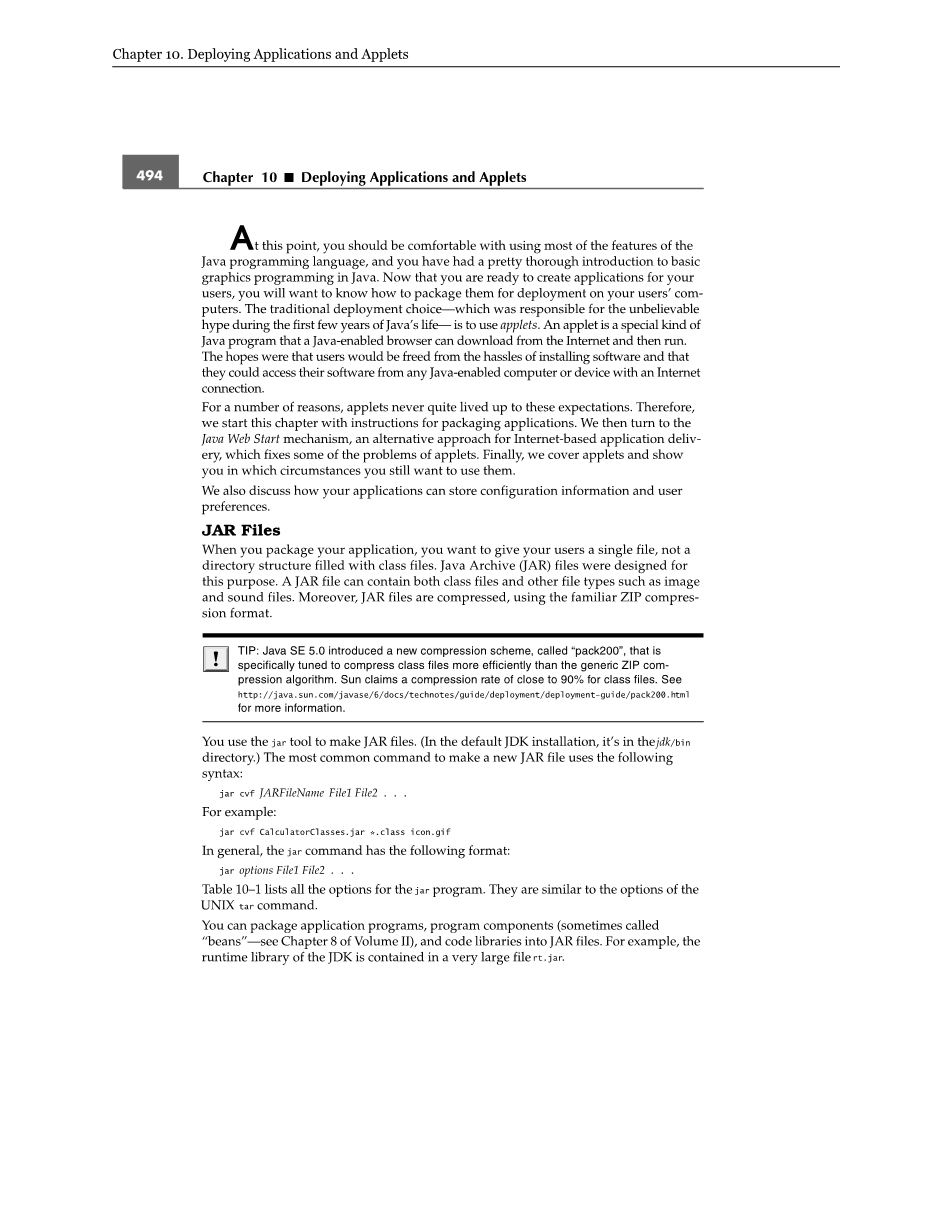 提示:Java SE 5.0引入了一种新的压缩方案,称为“ pack200”,该方案经过专门调整以比通用ZIP压缩算法更有效地压缩类文件。 Sun声称类文件的压缩率接近90%。 有关更多信息,请参见http://java.sun.com/javase/6/docs/technotes/guide/deployment/deployment-guide/pack200.html。