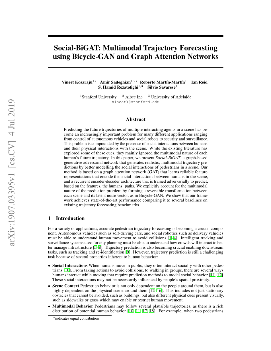预测一个场景中多种交互主体的未来轨迹,从自动汽车和社交机器人的控制到安全和监视,对于许多不同的应用来说都是一个越来越重要的问题。社会中人类之间交互和他们的物理行为加剧了这个问题。尽管现有文献已经发现了一些线索,他们主要忽略了每个人类的未来轨迹的多模态性质。在本文中,我们介绍了Social-BiGAT,一种基于图的生成对抗网络,可以通过对场景中人的社交互动进行建模,生成逼真的、多模式的轨迹预测。我们的方法是基于学习对场景中人类之间的社交互动进行编码的可靠特征,以及根据功能经过反复训练一预测人类的路径的对抗网络。我们明确地考虑了多种方式对于通过在每个场景及其潜力的噪声矢量的本质,例如Bicyle-GAN。我们证明了与其他几个基准相比,我们的工作框架达到了现有的轨迹预测中最先进的性能。