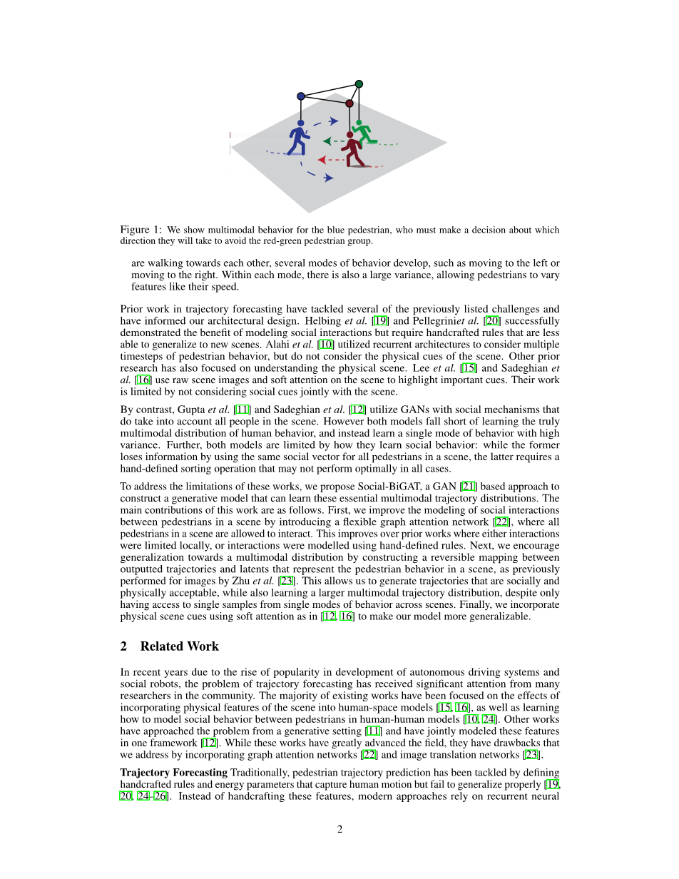 为了解决这些工作的局限性,我们提出了Social-BiGAT,这是一个基于GAN[21]的方法来构建一个可以学习这些基本多样轨迹分布的生成模型。这项工作主要的贡献如下:首先,我们通过引入灵活的注意力图网改进场景中人们的社交互动的建模,在这个场景中人们是可以互动的。这与之前的成果相比不论是在本地的限制,还是使用人工定义的规则对交互进行建模都有所改善。接下来,我们鼓励通过构造两个模型之间可逆映射类似推广到多样分布,输出场景中行人行为的轨迹和映像,正如之前Zhu等人[23]所做的。这使我们能够接受在社会上和生理上生成轨迹,同时也学习了更大的多峰轨迹分布,可以从跨场景的单一行为模式访问单个样本。最后,我们将加上物理场景提示中使用柔和注意力[12,16]使我们的模型更具通用性。