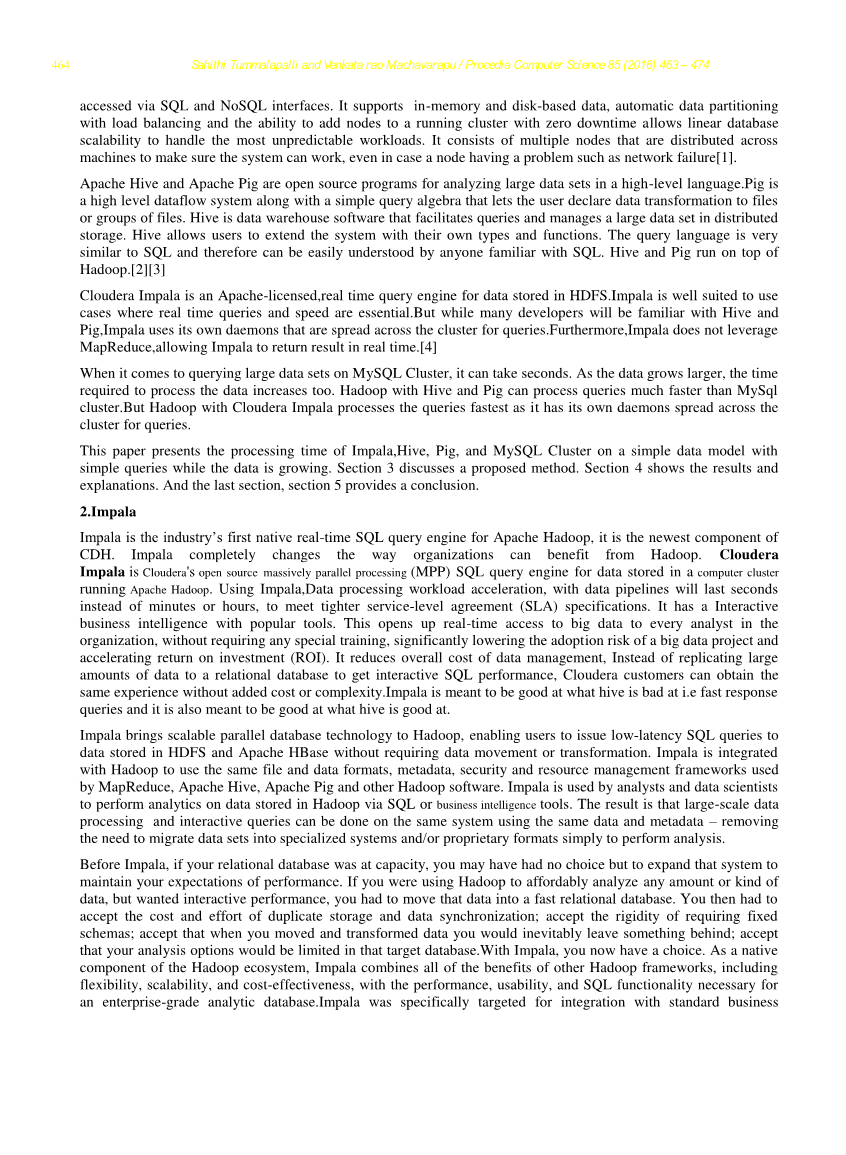 本论文介绍了在简单的数据模型上Impala,Hive,Pig和MySQL Cluster在数据增长时的处理时间。 第三部分讨论了一种建议的方法,第四部分展示了结果和说明。 最后一部分,即第五部分阐释结论。