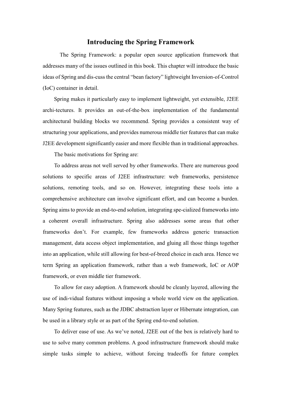 The Spring Framework: a popular open source application framework that addresses many of the issues outlined in this book. This chapter will introduce the basic ideas of Spring and dis-cuss the central “bean factory” lightweight Inversion-of-Control (IoC) container in detail.