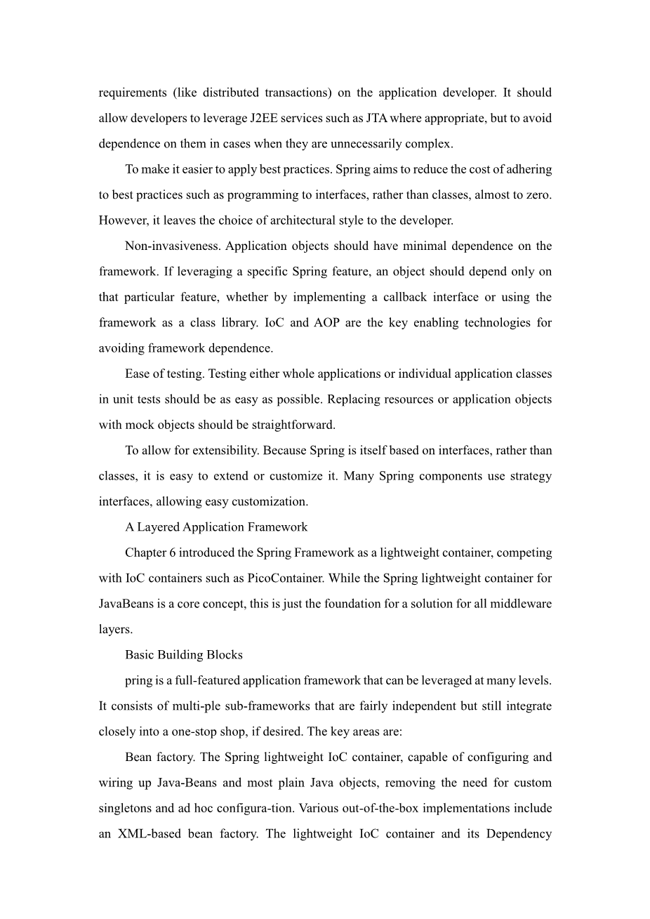 To address areas not well served by other frameworks. There are numerous good solutions to specific areas of J2EE infrastructure: web frameworks, persistence solutions, remoting tools, and so on. However, integrating these tools into a comprehensive architecture can involve significant effort, and can become a burden. Spring aims to provide an end-to-end solution, integrating spe-cialized frameworks into a coherent overall infrastructure. Spring also addresses some areas that other frameworks donrsquo;t. For example, few frameworks address generic transaction management, data access object implementation, and gluing all those things together into an application, while still allowing for best-of-breed choice in each area. Hence we term Spring an application framework, rather than a web framework, IoC or AOP framework, or even middle tier framework.