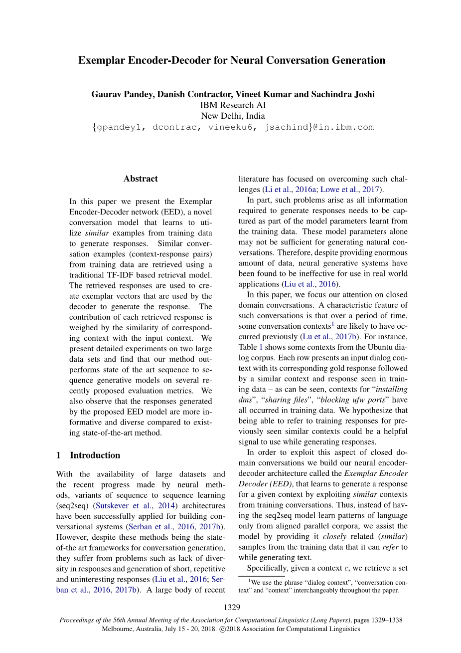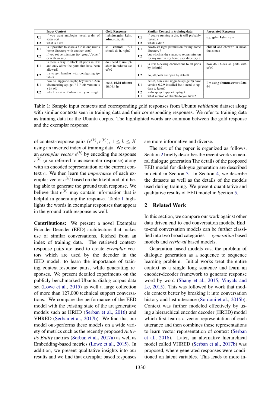 在某种程度上,由于生成响应所需的所有信息都需要作为从培训数据中学习的模型参数的一部分来捕获,因此出现了这样的问题。仅这些模型参数可能不足以生成自然对话。因此,尽管提供了大量的数据,神经生成系统已经被发现在现实世界应用中是无效的(Liu et al., 2016)。在本文中,我们将注意力集中在封闭域会话上。这种对话的一个特征是,在一段时间内,一些对话内容很可能以前就发生过(Lu et al., 2017b) 例如,表1显示了Ubuntu对话库中的一些上下文。每行显示一个输入对话框上下文,其对应的gold响应后面跟着一个类似的上下文和训练数据中的响应—可以看到,“安装dms”、“共享文件”、“阻塞ufw端口”的上下文都出现在训练数据中。我们假设,能够参照之前看到的类似情景的训练反应,可能是一个有用的信号,可以在生成反应时使用。为了利用闭域对话的这一方面,我们构建了我们的神经编码器解码器体系结构,称为示例编码器解码器(EED),它通过利用训练对话中的类似上下文来学习为给定上下文生成响应。因此,我们不让seq2seq模型只从对齐的并行语料库学习语言模式,而是通过从训练数据中提供紧密相关的(类似的)样本来帮助该模型,这些样本可以在生成文本时引用。