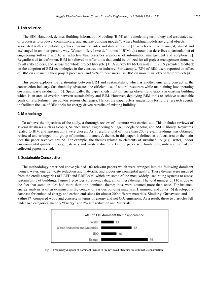 为了实现该研究的目标,对文献进行了彻底的审查。这包括对Scopus,ScienceDirect,Engineering Village,Google Scholar和ASCE库等几个数据库的评论。选择了与BIM和可持续性相关的关键词。结果,总共获得了200多个相关读数,审查并安排成一组主导主题。本文中的一个主题被定义为一个重点领域或论文围绕的主要思想。例如,主题涉及可持续性要素(例如,水,室内环境质量,能源,材料和减少废物)。由于纸张尺寸的限制,仅引用了所收集纸张的一部分。