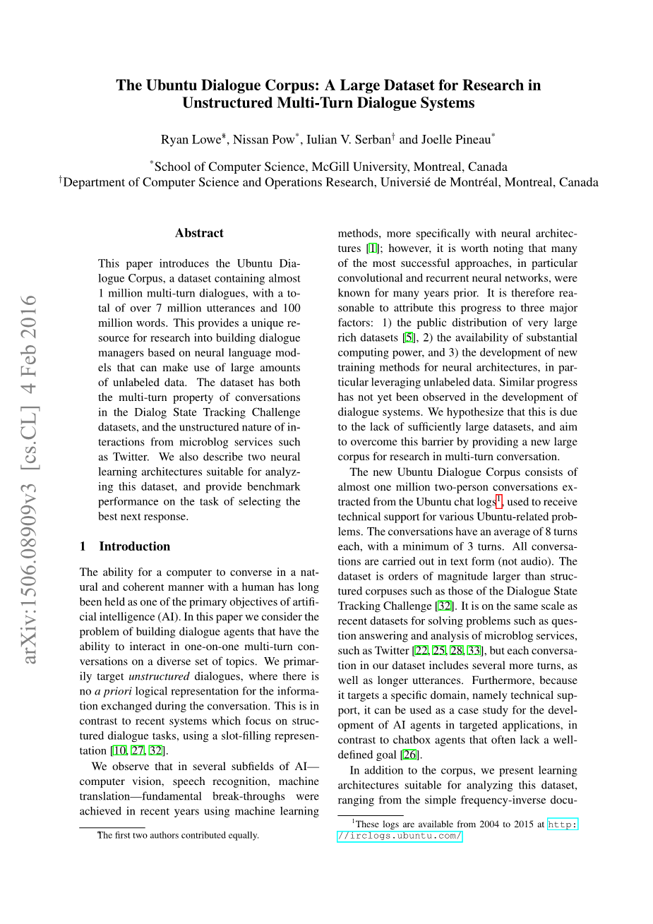 我们观察到,在AI计算机视觉的几个子领域中,语音识别、机器翻译的基本突破是近年来使用机器学习方法。更具体地说是用神经架构实现的。然而,值得注意的是,许多最成功的方法,特别是卷积和递归神经网络,早在多年前就已为人所知。因此,将这一进展归因于三个主要因素是合理的:1)非常大的丰富数据集的公开分布2)大量计算能力的可用性3)神经架构的新训练方法的开发,特别是利用未标记的数据。在对话系统的发展方面尚未观察到类似的进展。我们假设这是由于缺乏足够大的数据集,并且旨在通过为多轮对话研究提供新的大型语料库来克服这一障碍。