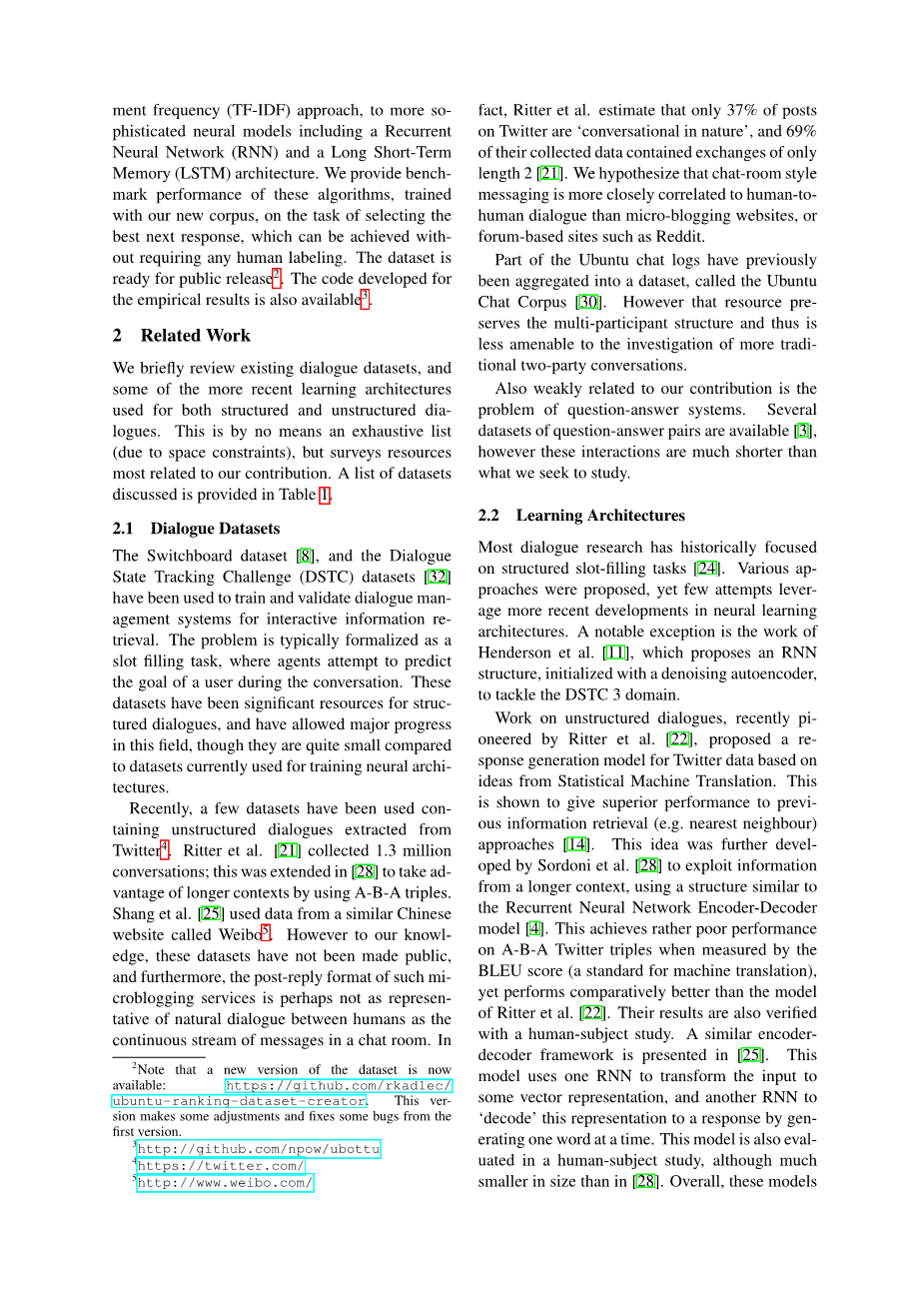 最近,一些数据集被用于包含从Twitter提取的非结构化对话。里特等人收集了130万次谈话。通过使用A-B-A三元组,这被延伸到了更长的背景优势。尚等人使用的数据来自类似微博的中文网站。然而据我们所知,这些数据集尚未公开,此外,这些微博客服务的回复后格式可能不像人类之间的自然对话那样代表聊天室中连续的消息流。事实上,里特等人估计,Twitter上只有37%的帖子属于“会话性质”,其收集数据的69%只包含长度为2的交换。我们假设聊天室风格的消息传递与人与人之间的对话关系比微博客网站或基于论坛的网站(如Reddit)更紧密。