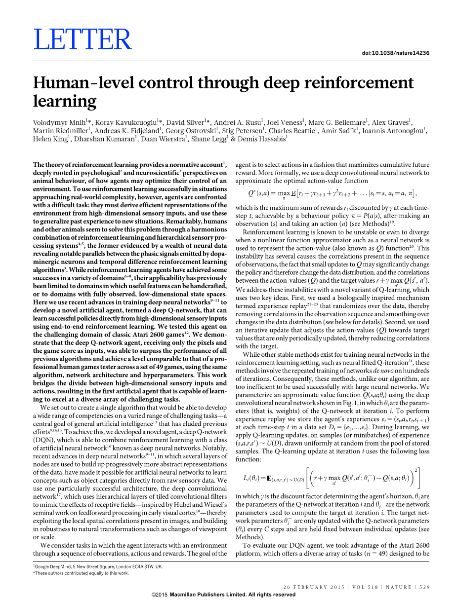 强化学习理论对关于智能体在一个环境中如何优化他们的行为提供了规范性的说明,其根源是对动物行为研究得到的关于心理学和神经学的观点。在接近真实世界复杂度的情境下,强化学习已经获得了一些成果;然而智能体也面对一些困难的挑战:必须从环境中的高维感觉输入中得到有效的特征,并且要使用它们概括过去的经验来应付新的场景。明显地, 人类和其他动物看起来通过优雅地联合强化学习与多层次感觉处理系统来处理这些问题,大量神经数据证明神经元发射的多巴胺相位信号与时间差分强化学习算法有明显的相似。当强化学习智能体在多领域获得成功,它们的适用性以前仅限于可以手工制作有用特性的领域, 或者可以被完全观察、处于低维状态空间的领域。因此我们最近提出了通过训练深度神经网络来开发一个称为“Deep Q-Network”的新型人工智能体,它可以通过高维感觉输入直接学习成功的策略来实现端到端的强化学习。我们在传统 Atari2600 游戏挑战领域测试了这个智能体。我们确信深度 Q 网络智能体仅仅从像素和游戏得分获取输入,使用相同的算法、网络结构和超参数实现了对于 49 个游戏与专业人类游戏测试人员同等级别的表现,能够超越以前所有算法。这项工作链接了高维感觉输入和行动,从而产生了第一个能够在各种挑战中学习性能优异的人工智能体。
