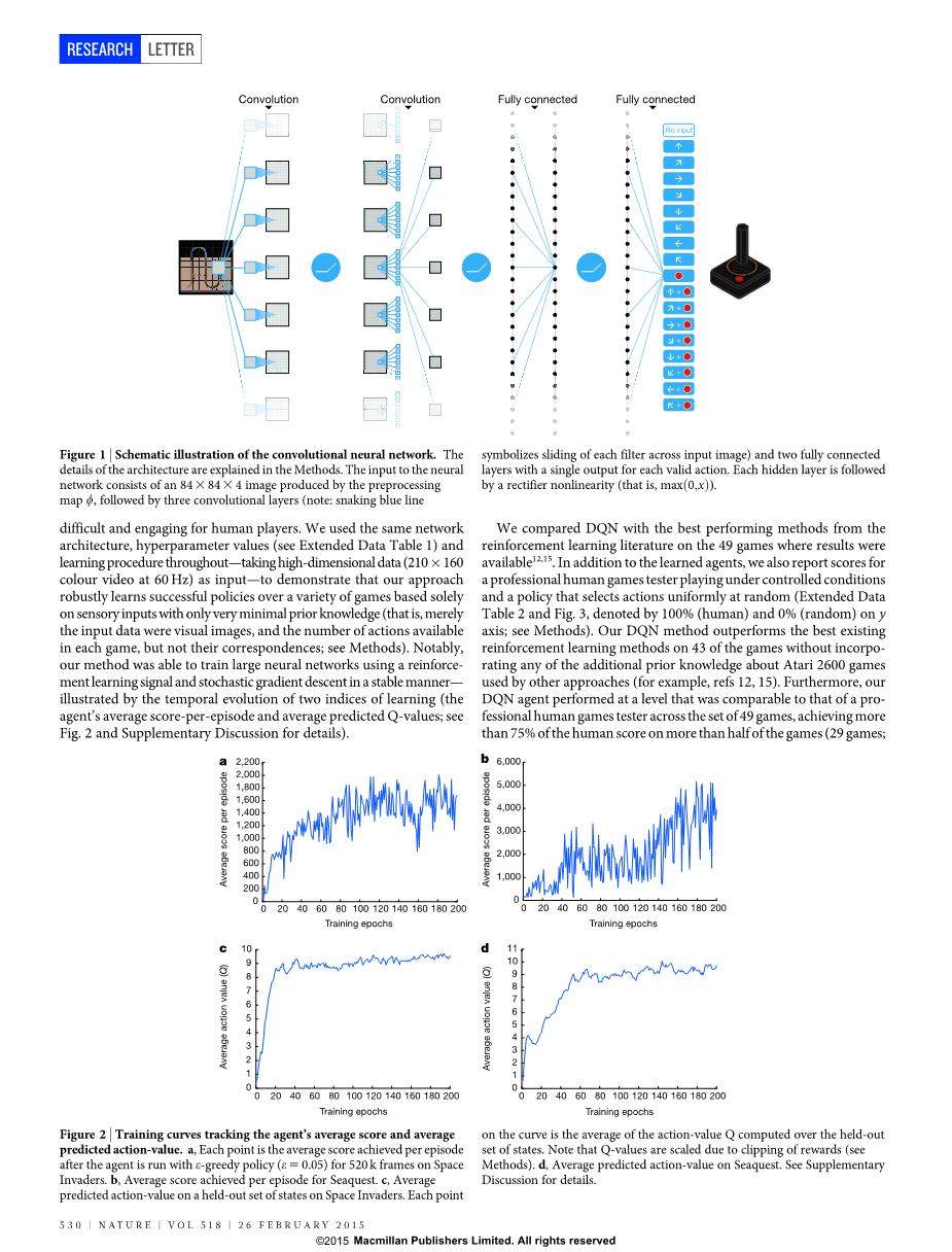 为了评估我们的DQN 智能体,我们利用了 Atari 2600 平台,它提供各种各样的挑战(n=49), 被用来吸引人类玩家, 供玩家挑战。我们使用了相同的网络结构、超参数值(见附加数据表 1) 和不变的学习程序——获取高维数据(60Hz 的 210times;160 彩色视频)作为输入——来证明我们的方法可以在仅仅基于感官的输入且具有很少先验知识的情况下可以成功地学习到各种各样的游戏策略(输入仅仅是可视化图像,和每个游戏中可用的动作数量,但是没有一一对应的关系, 见方法)。值得注意的是,我们的方法可以以一种稳定的方式使用强化学习信号和随机梯度下降训练巨大的神经网络——通过两个学习指标的时间演变来说明(智能体的每幕的平均得分和预测 Q 值的平均值;参见图 2 和补充讨论的细节)。