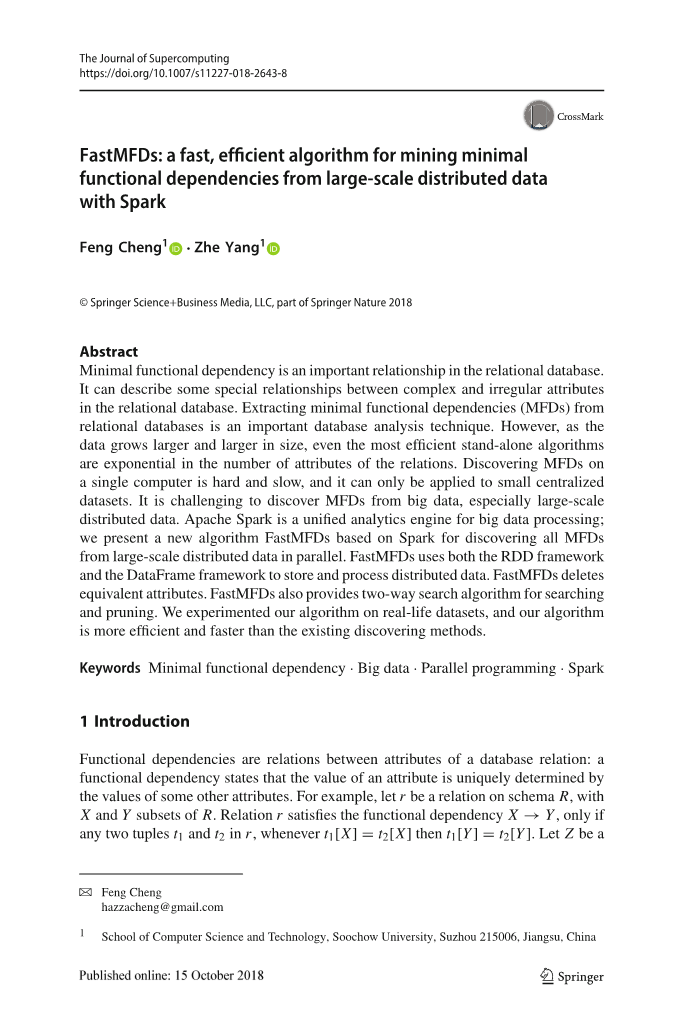 最小函数依赖是关系数据库中的一个重要关系。它可以描述关系数据库中复杂和不规则属性之间的某些特殊关系。从关系数据库中提取最小功能依赖(MFD)是一种重要的数据库分析技术。然而,随着数据量的日益增长,即便最高效的单机算法在关系属性的数量增长上是呈指数级的。在单机上挖掘发现 MFD 是困难且低效的,只能应用于小型集中式数据集。从大数据中,尤其是大规模分布式存储的数据集中发现 MFD 是极具挑战性的。 Apache Spark 是一个应用于大数据处理的分析引擎; 我们提出了一种基于 Spark 实现的新算法FastMFD,用于并行发现大规模分布式数据集中的所有 MFD。 FastMFD 使用 RDD 框架和DataFrame 框架来存储和处理分布式数据集。 FastMFD 删除等效属性。 FastMFD 还提供了用于搜索和修剪的双向搜索算法。通过在真实数据集上进行算法实验,本研究提出的算法比现有的函数依赖发现方法更高效、更快。