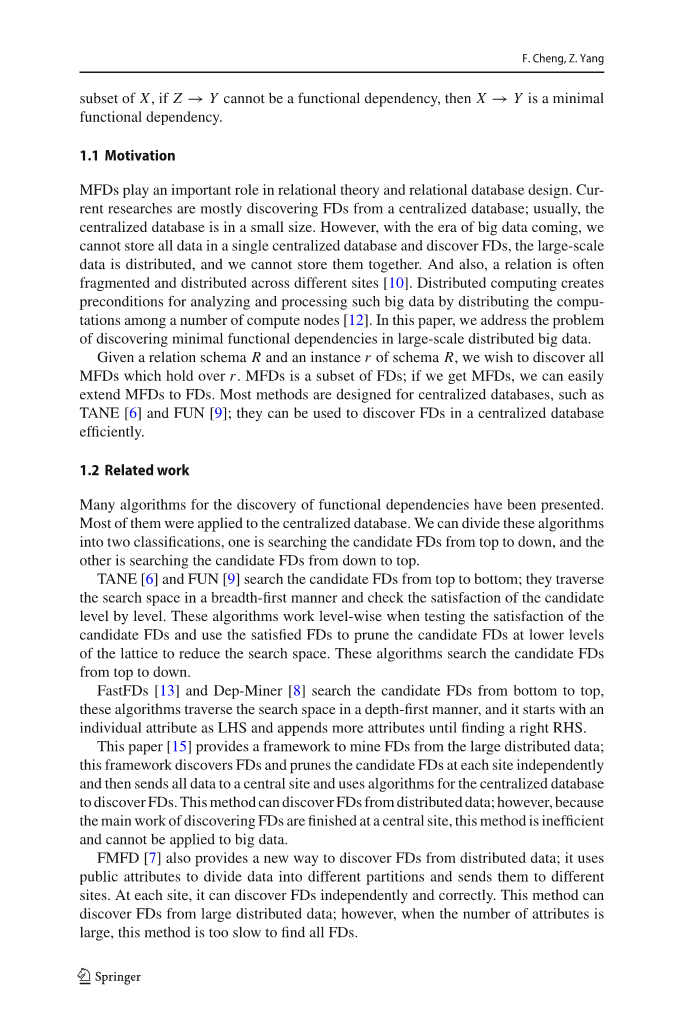 MFD在关系理论和关系数据库设计中发挥着重要作用。当前的研究主要是从集中式数据库中发现FD; 通常,集中式数据库的规模很小。然而,随着大数据时代的到来,我们无法将所有数据存储在单个集中式数据库中并发现FD,大规模数据是分布式的,我们无法将它们集中存储在一起。而且,关系通常是分散的,并且分布在不同的节点[10]。分布式计算通过在多计算节点之间合理分配计算量为分析和处理此类大数据创造了前提条件[12]。在本文中,我们解决了在大规模分布式大数据中发现最小功能依赖性的问题。