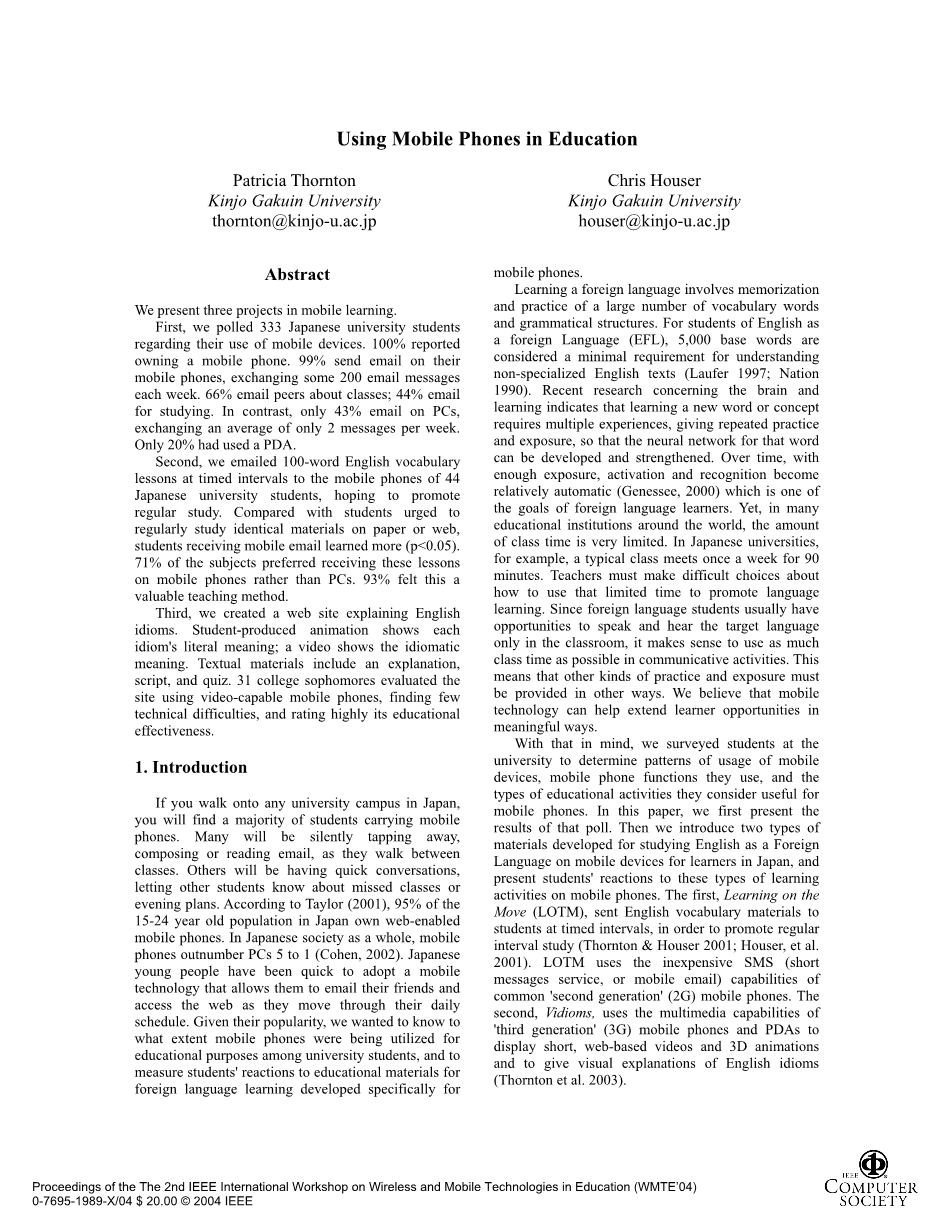 考虑到这一点,我们对学生们进行了调查。确定移动使用模式的大学设备、其使用的移动电话功能以及他们认为有用的教育活动类型移动电话。本文首先介绍了调查的结果。然后我们介绍了两种类型为学习英语而开发的材料日本学习者在移动设备上的语言,以及当前学生对这些类型学习的反应手机上的活动。第一,在手机上学习移动(LOTM),将英文词汇材料发送到定时间隔的学生,以促进定期间隔研究(Thornton amp; Houser 2001; Houser, et al.2001)LOTM使用普通的“第二代”(2G)移动电话的廉价SMS(短消息服务或移动电子邮件)功能。第二种是Vidioms,它使用“第三代”(3G)移动电话和PDA的多媒体功能来显示基于网络的短视频和3D动画,并给出英语成语的直观解释(Thornton等人)。(2003年)。