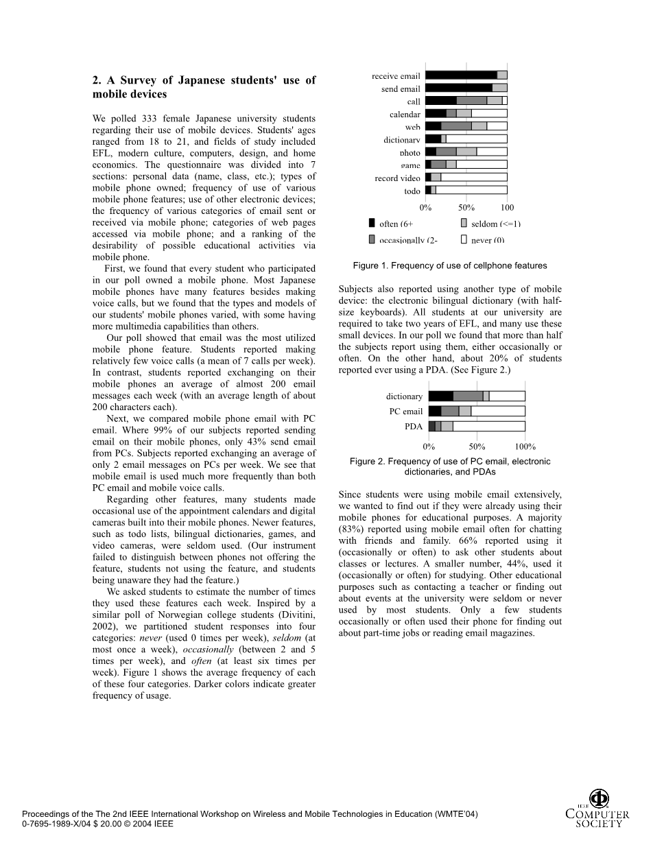 我们介绍了三个移动学习项目。首先,我们调查了333名日本大学生使用移动设备的情况。报告显示每个人拥有一部手机,99%通过他们的移动手机发送交换大约200封电子邮件。每个星期。66%的人给同伴发关于课程的邮件;为了学习44%的人发电子邮件。相比之下,PC上只有43%的电子邮件,平均每周只交换2条消息。只有20%的人使用过PDA。