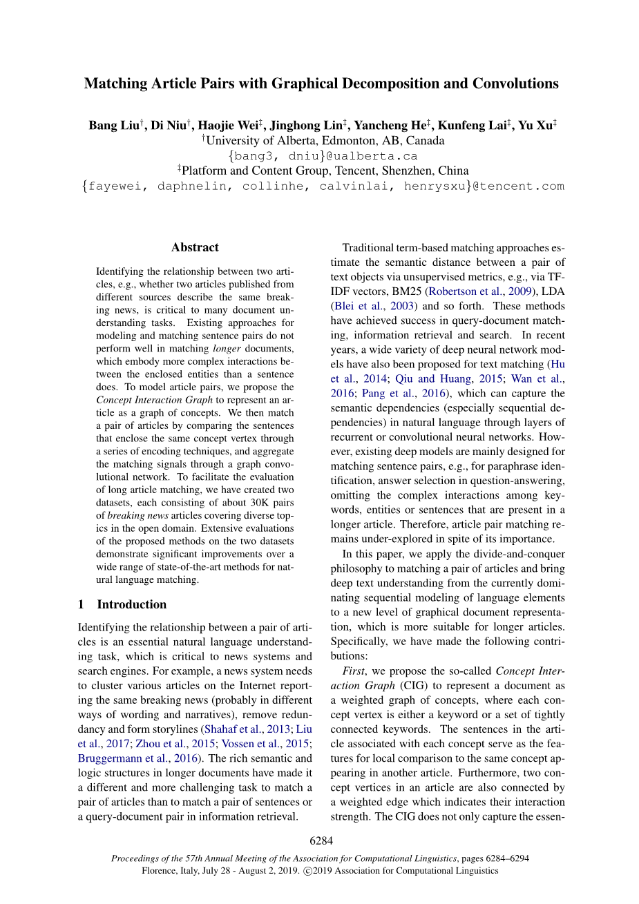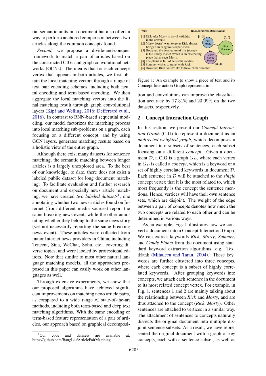 识别两篇文章之间的关系,例如,从不同来源发表的两篇文章是否描述了同一突发新闻,对许多文档的理解任务至关重要。现有的用于建模和匹配句子对的方法在匹配较长文本时效果不佳,我们的研究体现了:与句子相比,在封闭实体之间的交互作用更加复杂。为了对文章对进行建模,我们提出了概念交互图,以概念图的形式表示一篇文章。然后我们通过一系列编码技术比较了包含相同概念顶点的句子,从而匹配获得一对文章,并通过图卷积网络聚合匹配信号。为了便于评估长文本匹配情况,我们创建了两个数据集,每个数据集由大约3万对重大新闻报道,涵盖了开放领域中的各种热门。在两个数据集上对提出的方法进行的广泛评估表明,对于自然语言匹配而言,最先进的方法有很大的改进。