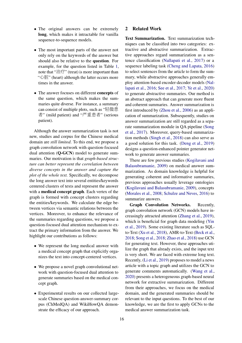 最近,(Li et al。,2019)建议使用主题图对新闻文章进行建模,并利用GCN自动生成评论。 (Wang et al。,2020)提出了一种基于异构图的神经网络,用于提取摘要。与他们的方法不同,我们专注于医学领域,并且生成的摘要应与输入问题相关。据我们所知,我们是第一个将GCN应用于医学答案汇总任务的人。