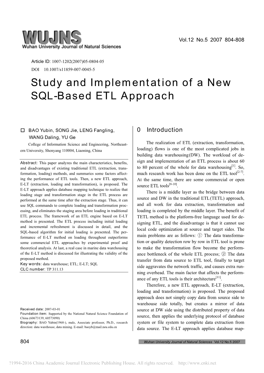 摘要: 本文分析了现有传统ETL(提取,转换,加载)方法的主要特点,优点和缺点,并总结了一些影响ETL工具性能的因素。然后,提出了一种新的ETL方法E-LT(提取,加载和转换)。E-LT方法应用数据库映射技术来实现ETL过程中的加载阶段和转换阶段在提取阶段之后同时执行。因此,它可以使用SQL命令完成加载和转换处理,并消除了传统ETL过程中加载前的暂存区域。提出了一种基于E-LT方法的ETL引擎框架。详细讨论了ETL流程,包括初始加载和增量刷新,提出了基于SQL的初始加载算法。通过实验证明和理论分析,E-LT方法在整个装载过程中的性能优于某些商业ETL方法。最后,以E-LT方法在海洋数据仓库中的实际情况为例,讨论了该方法的有效性。