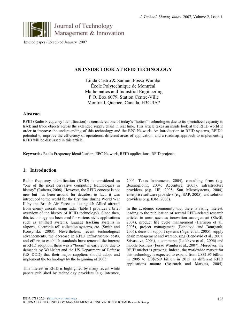 在学术社区,也有了兴趣的提升,导致了几个有关RFID的研究文章的出版等领域的创新管理(Sheffi, 2004),产品生命周期管理(Harrison et al., 2005),项目管理(Bendavid and Bourgault, 2005),决策支持系统(Ngai et al., 2005),供应链管理和仓储(Bendavid et al., 2007; Srivastava, 2004),电子商务(Lefebvre et al., 2006)和移动业务(Fosso Wamba et al., 2007)。此外,RFID市场在成长,作为不同的射频识别应用程序,这个技术的全球市场预计将从2005年的19.5亿美元扩大到2015年的269亿美元(Research and Markets, 2005)。
