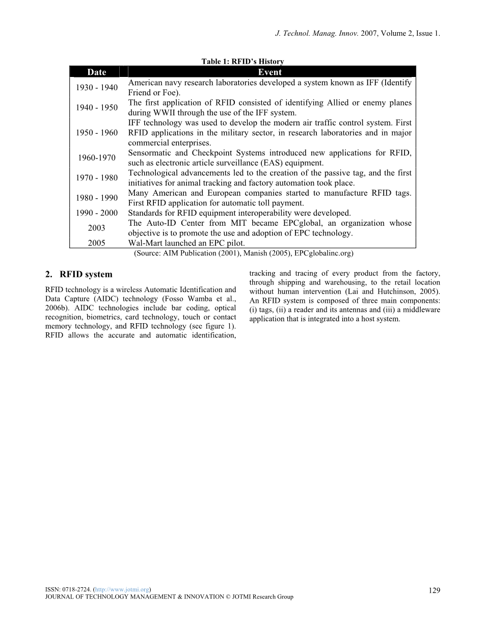无线射频识别技术(RFID)被认为是“历史上最普适计算技术之一”(Roberts, 2006)。然而,RFID的概念并不新鲜,已经存在了几十年;事实上,它在第二次世界大战期间面向世界,被英国空军用于使用雷达从敌军的飞机中区分盟军的飞机(表1为射频识别技术的历史提供了一个简要的概述)。从那时起,这一技术已被用于各种领域应用,如防盗系统,在机场行李追踪系统,电子收费系统等。(Smith and Konsynski, 2003).然而,最近技术的进步,RFID基础设施成本的降低,使努力建立新的标准去应用RFID有了新的兴趣;由于沃尔玛和美国国防部的要求,这项技术在2003年初有了一个“繁荣”时期,他们的主要供应商采取和实施这项技术在2005年初。