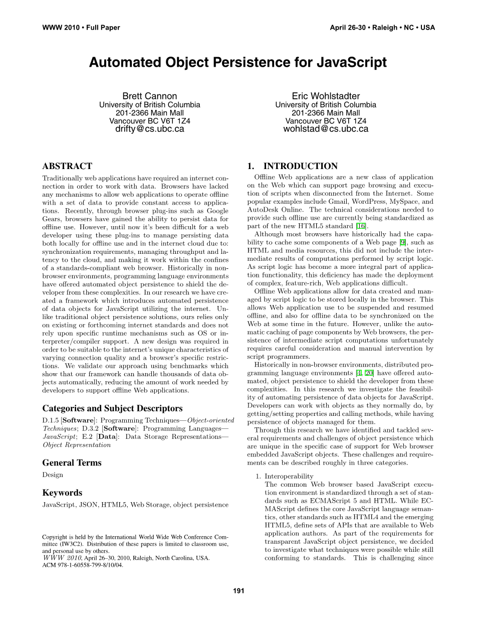 离线使用数据的持久性现在被广泛部署于所有主要的浏览器。某些支持提供给了简单的哈希映射,也提供给了SQL风格的数据库API。然而,没有任何现有机制的直接支持任一对象的结构化数据或自动持久性。这意味着,开发人员仍然必须自己解决若干困难问题。