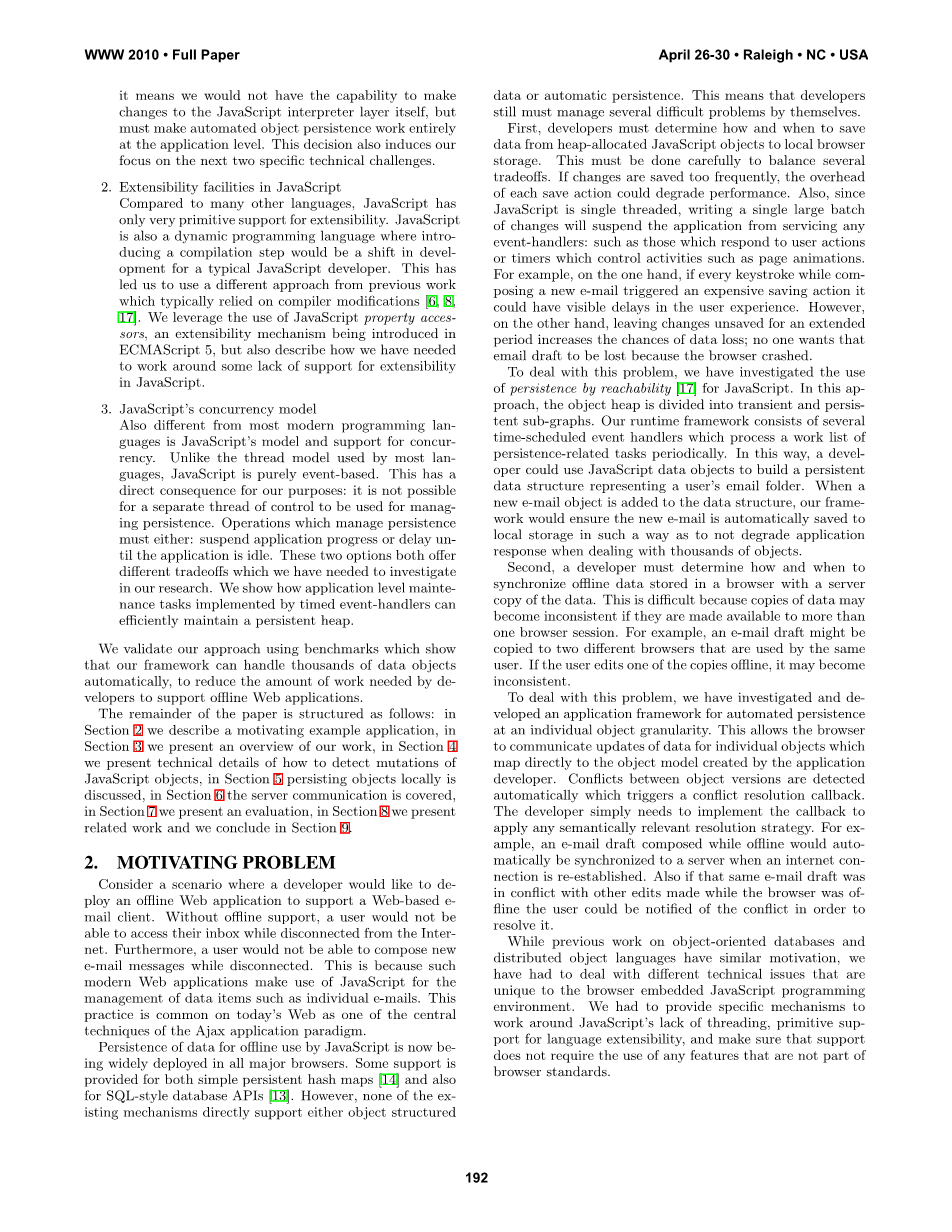 本文的其余结构如下:第2节中,我们描述了一个激励的示例应用程序,在第3节我们展示了我们的工作的概况,在第4节我们展示了如何检测JavaScript对象的突变技术细节,在第5节就局部对象持久化进行了讨论,第6部分涵盖了服务器的通信,在第7节我们提出了一个评估,在第8节,我们展示了相关的工作,我们在第9节进行总结。
