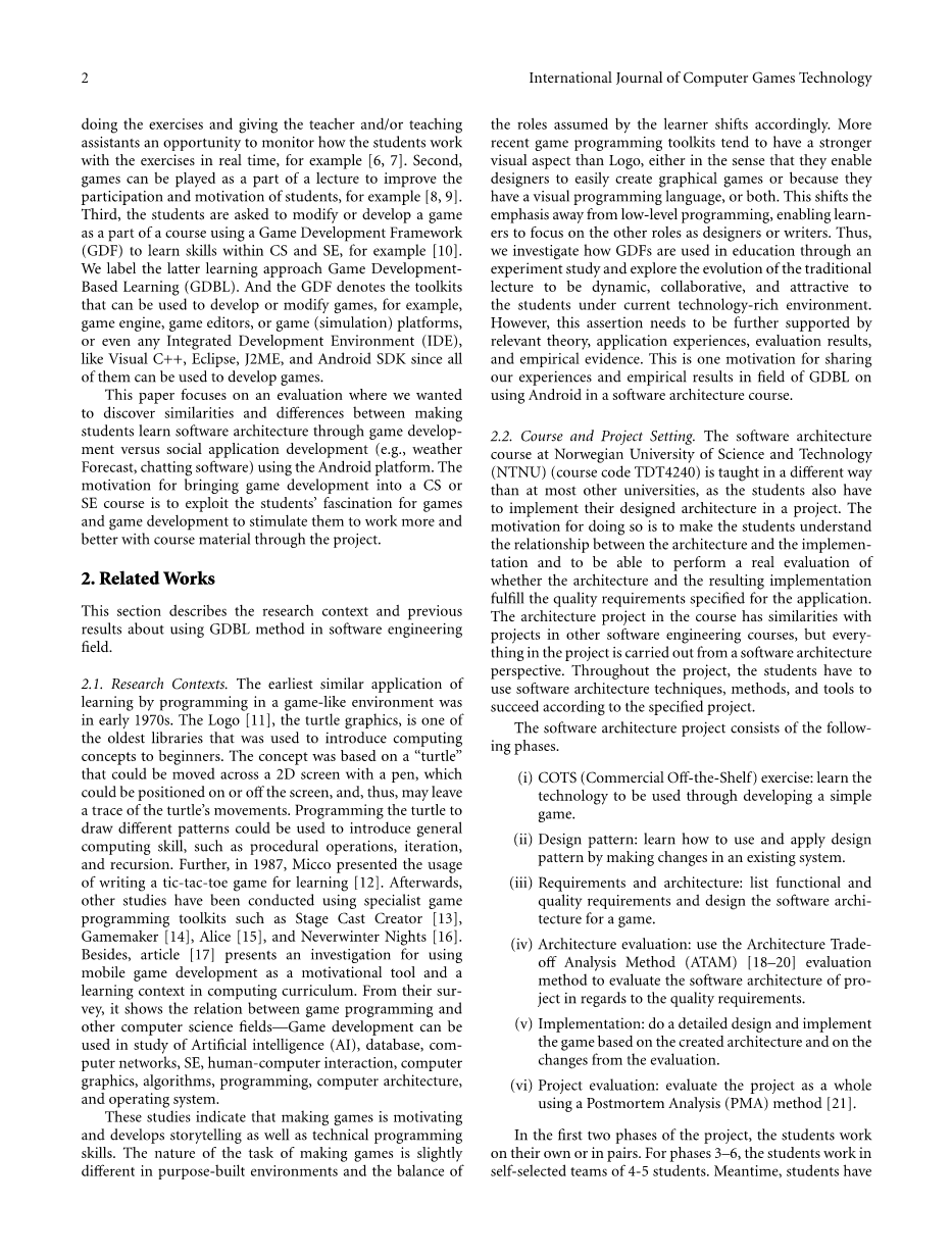 这些研究表明,游戏是激励和发展故事以及技术的编程技巧。对制作游戏的任务自然是特制的环境略有不同,所扮演的角色的平衡者承担相应改变。最近的游戏编程工具往往比标志更强的视觉方面,无论是在这个意义上,他们使设计人员能够轻松地创建图形游戏,因为他们有一个可视化的编程语言,或两者都有。这种转移的重点从低级编程,使学生专注于其他角色设计师或者作家。因此,我们探讨如何通过实验研究和教育中的应用与探讨传统的向丰富的环境下的学生讲授进化是动态的,合作的,和有吸引力的目前的技术。然而,这一说法需要相关理论,进一步支持的应用经验,评价结果与经验证据。这是分享我们的经验和实证研究领域gdbl使用Android软件体系结构课程的原因之一。