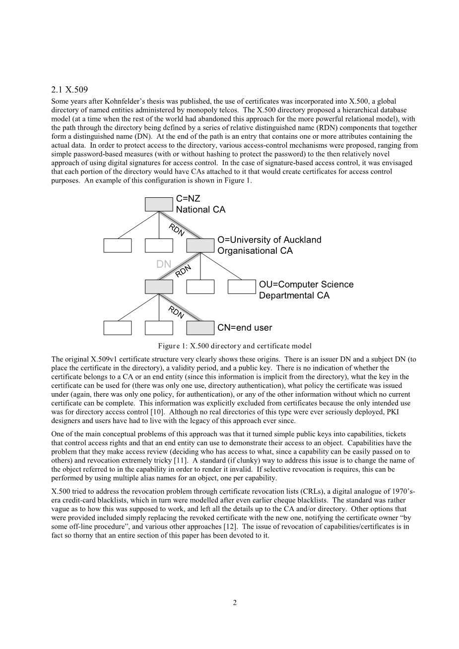 Kohnfelder的论文发表几年后,证书的使用被纳入全球X.500由垄断电信公司管理的命名实体目录。X.500目录提出了层次数据库模型(当时世界其他国家已经放弃了这种方法更强大的关系模型),通过目录的路径被定义为一系列相对专有名称(RDN)组件在一起形成一个专有名称(DN)。在路径的末尾是一个包含一个或多个包含实际数据的属性的条目。为了保护对目录的访问,提出了各种各样的访问控制机制,从简单的基于密码的措施(无论是否使用哈希来保护密码)到使用数字签名进行访问控制的相对新颖的方法。在基于签名的访问控制方面,这是设想的目录的每个部分都会附加CA,以便为访问控制创建证书