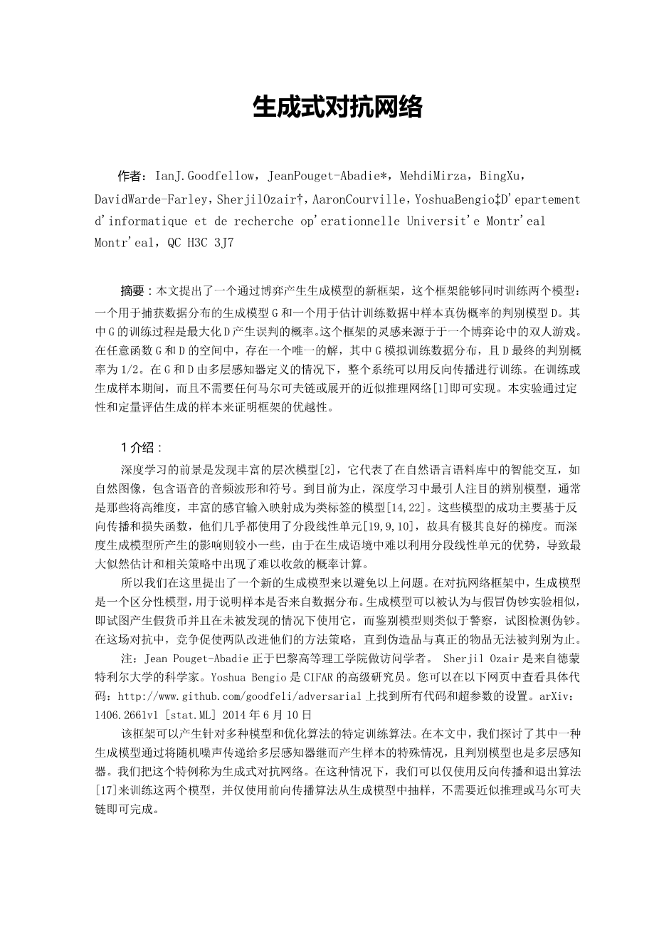 lowast;Jean Pouget-Abadie is visiting Universitacute;e de Montracute;eal from Ecole Polytechnique. dagger;Sherjil Ozair is visiting Universitacute;e de Montracute;eal from Indian Institute of Technology Delhi Dagger;Yoshua Bengio is a CIFAR Senior Fellow. 1All code and hyperparameters available at http://www.github.com/goodfeli/adversarial