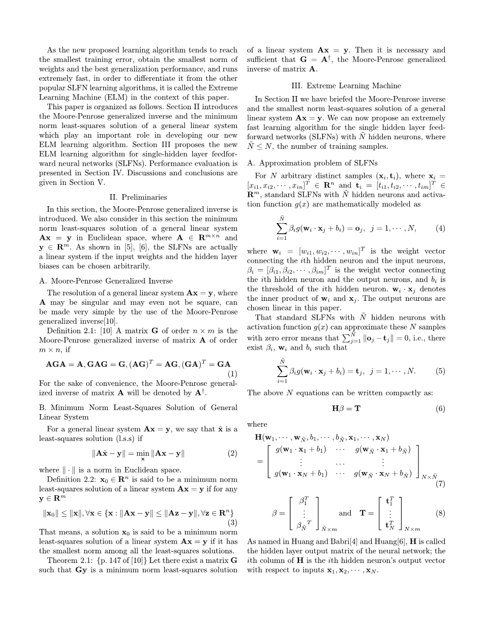 本文组织如下。第二节介绍了通用线性系统的摩尔-彭罗斯广义逆和最小范数最小二乘解, 它在开发新的ELM学习算法中起着重要的作用。第三节提出了一种新的单隐层前馈神经网络 (SLFNs) ELM学习算法。绩效评估载于第四部分。讨论和结论在第五节中给出。