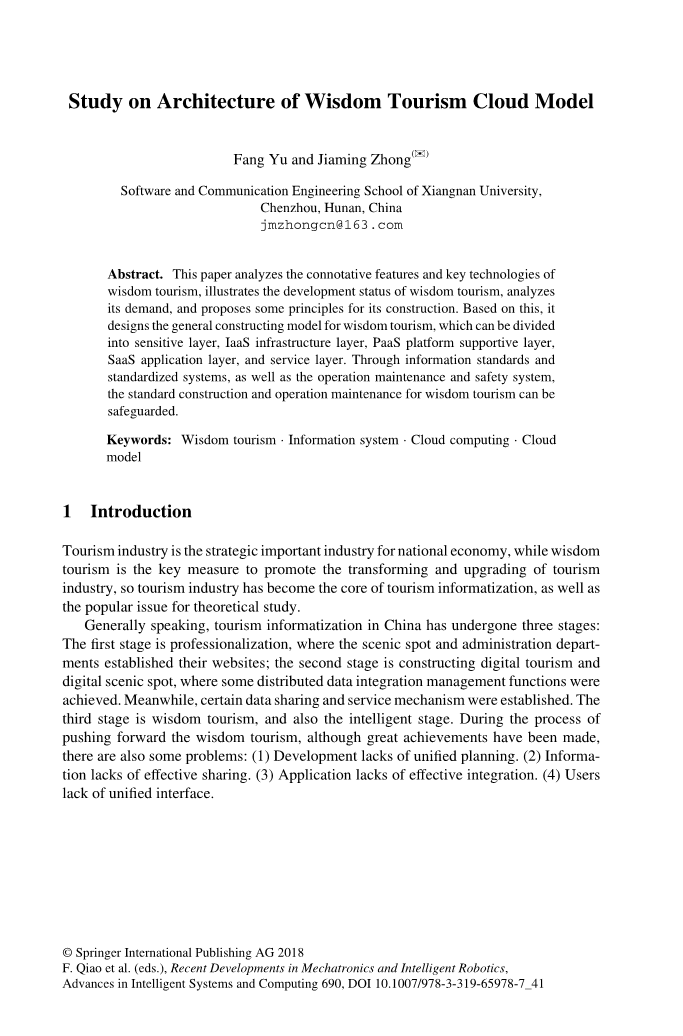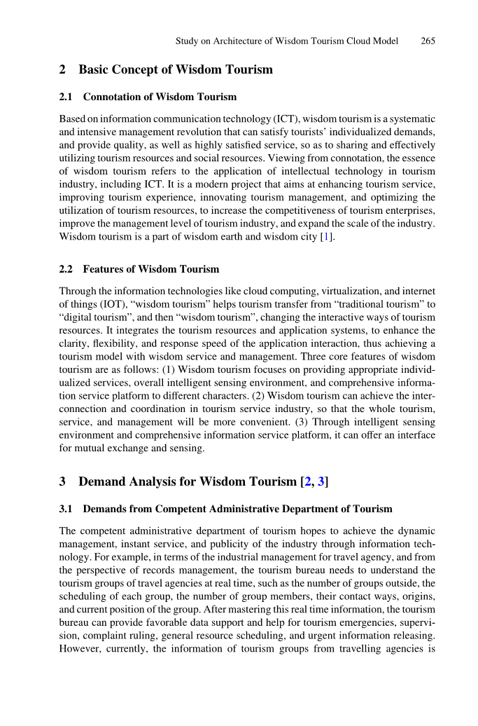 2. Qin, L.J.: Public tourism information service at tourism cloud times. J. Tour.Trib. 27(2), 7–10 (2012) Study on Architecture of Wisdom Tourism Cloud Model 269