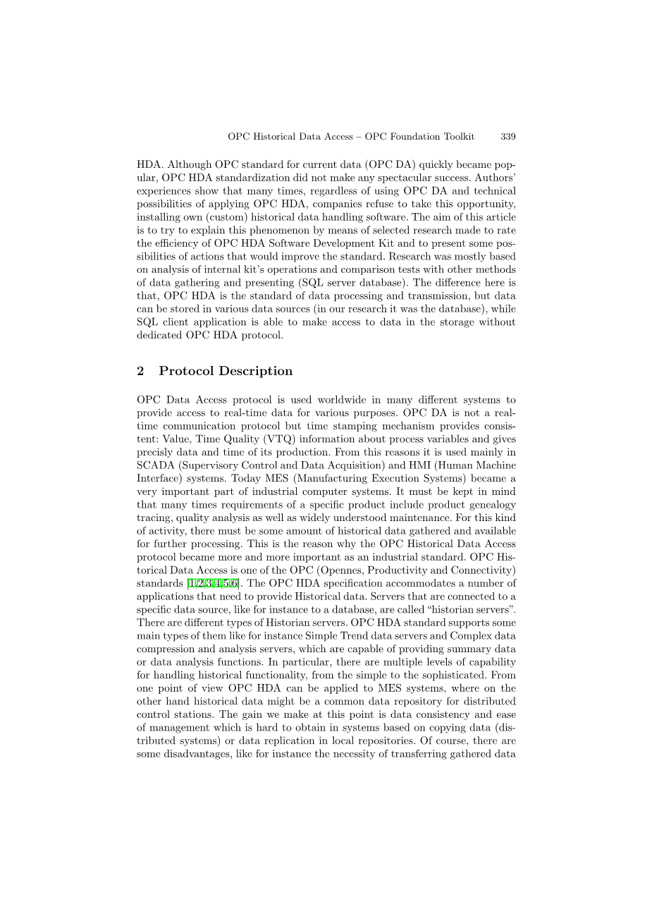 在分布式工业控制系统正常运行的基本原理是数据交换。它触及到测量数据以及控制命令。介绍了许多不同的软件解决方案从一开始使用这种类型的应用程序。最初这种类型的系统显示的必要性具有不仅现在,而且之前的数据以及它们的时间戳。其中一个原因是效率的分析,另一个是生产计划。各种各样的转向应用和缺少通讯标准从许多不同的方面影响历史数据存储,最常见的是像数据库这样的辅助程序的运用。这种多样性引起这样的事实,历史数据不同于建在不同的结构,使得分组和简单数据计算成为可能。重要的区别也是时间戳。它没有定义是否应该改变的时刻检测(如传感器,在可编程逻辑控制器)或数据的时刻写(如数据库)。它介绍很多转换历史数据而引起的连接彼此不同的系统。同时当工业通信作为标准(OPC),历史数据标准性规范创建---OPC HDA.尽管OPC标准对于现今的数据(OPC DA)迅速变得流行,但是OPC HDA标准化并没有获得巨大的成功。作者的经验表明,许多次无论使用OPC DA和应用OPC技术可能性,注重科技进步企业拒绝接受这个机会,安装自己的(自定义)历史数据处理软件。本文的目的是试图解释这种现象通过选择研究了OPC软件开发工具包注重科技进步的效率和提供了一些可能的行动,提高标准。研究主要是基于分析内部设备的操作和与其他方法对比测试数据的收集和展示(SQL server数据库)。区别在于,OPC HDA是数据处理和传输的标准,但数据可以存储在不同的数据源(在我们的研究数据库),而SQL客户机应用程序能够访问数据存储没有专用的OPC协议。