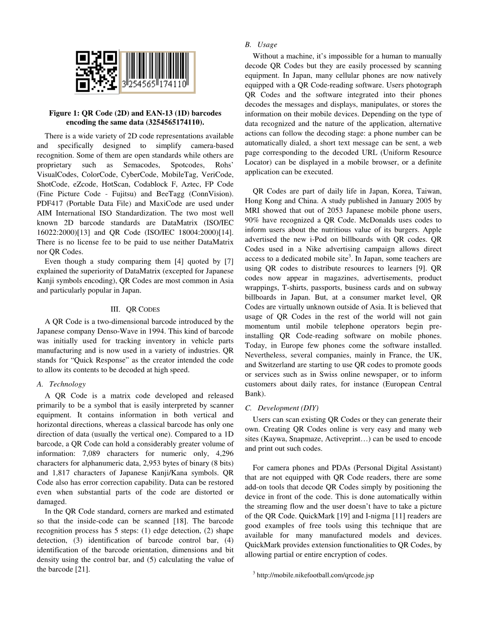 在对象识别领域,RFID和NFC2技术被认为是最新的一代,但是,由于基础性的技术和概念的简洁性,条形码仍然被认为是一个有意思的选择。的确,任何廉价的打印机都可以使用,但是制造RFID需要一个特殊的专用设备。之前的研究表明,使用条形码与配备有摄像头的手机之间的相关性。研究了超连接真实世界的原型应用:过敏助剂,某一产品的原产地,价格比较,即时的易趣拍卖等等。例如,过敏检查的应用可以是基于一维(1D)条形码的识别。一旦用户定义了一个包含了他或她对所有物质过敏的信息,在产品的条形码前拿着手机就可以给用户一个关于产品是否含有过敏物质的简单回答。