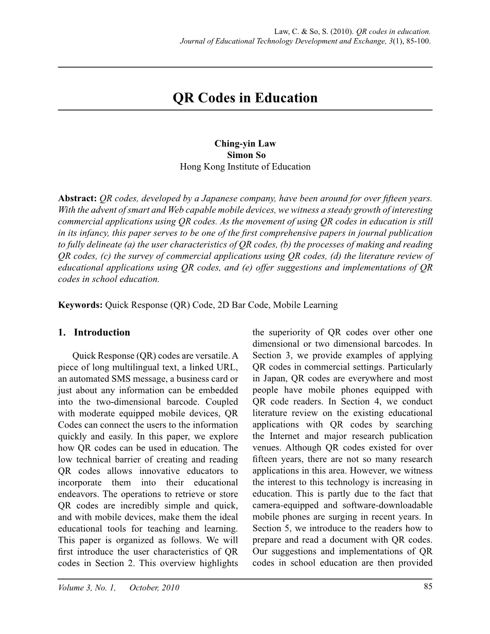 快速响应(QR)码是多才多艺。一块长多语言文本,链接的网址,一个自动化的短信,名片或只是任何信息可以被嵌入到二维条码。再加上适度的配备移动设备,二维码可以快速方便地将用户连接到的信息。在本文中,我们将探讨如何二维码可以在教育中使用。创建和读取二维码的低技术壁垒使创新教育将其纳入自己的教育事业。操作检索或存储二维码是令人难以置信的简单快捷,并与移动设备,使他们理想的教育工具的教学和学习。