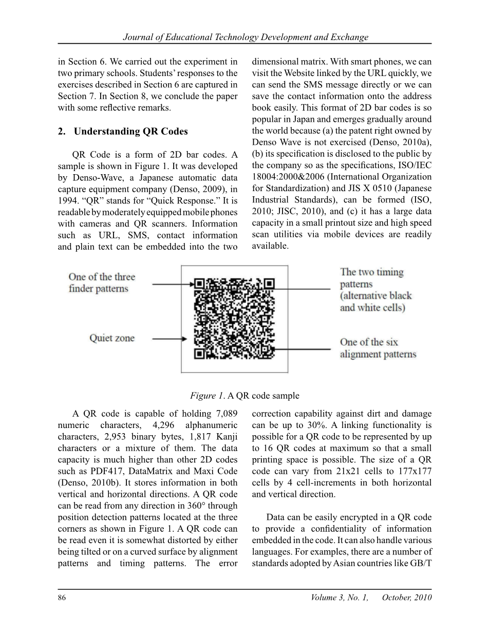 摘要:二维码,由日本公司开发的,已经存在了超过15年。随着智能和网络能力的移动设备的出现,我们看到的使用二维码有趣的商业应用稳步增长。作为教育使用二维码的运动还处于起步阶段,本文用以在刊物上公布的第一个综合性的报纸之一,充分划定(一)二维码的用户特征,(二)制作的过程和读取二维码,(三)使用二维码,(四)使用二维码教育应用的文献综述,以及(e)提供建议,在学校教育的二维码实现商业化应用调查。