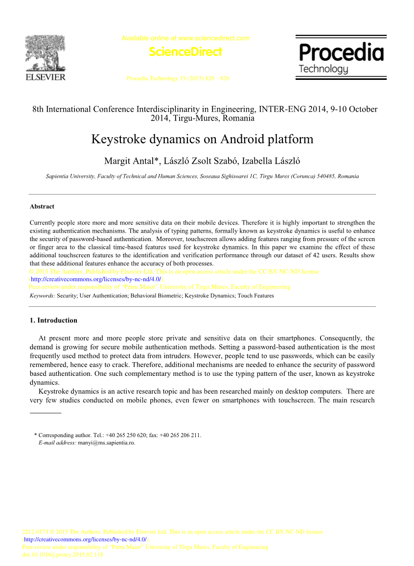现在人们将越来越多的私人数据存储在他们的移动设备内,因此,加强现有的身份验证机制是非常重要的。这种分析模式在专业领域内称作按键动态,主要用于加强输入密码的安全性能。而且,触屏还添加了其他功能特征:范围从屏幕压力或键盘对于经典的时效性都被应用于击键动力学,在这个论文里面,我们检验这些添加的屏幕功能对身份验证机制的功能作用,并且通过验证我们的42个用户的数据库的运转。结果显示这些添加的功能加强了双重进程。