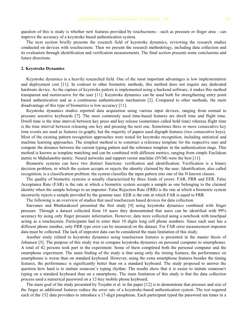 击键动力学是一个热门的研究领域,最重要的优势之一是成本低并且安装简便,与其他生物识别方法相比,该方法不需要任何专门的硬件设备[11]。因为作为掌控击键模式是应用一个后端软件。这使得该方法可以为用户的透明和非侵入性发挥功能,基建动力学可以被用于加强输入密码时的身份验证和连续的身份验证机制[2]。与其他的方式相比较,这种生物识别的精确度并不高[11]。击键动力学,击键力学的研究报告收录了各种输入设备的数据,从常规的到压力敏感的键盘,最常用时效性能是间歇时间和运转时间。间歇时间是按键和输出之间的时间间隔(又是被称作停歇功能),而运行时间是上一个字符的输出和下一个字符输入之间时间。常用的功能(n-图)是应用三个或更多的连续击键时间,但是大部分论文采用有向图(两个连续的击键)。大多数现有的识别方法是检测按键识别性能,包括分析研究数据和机器学习的方法。最简单的方法是为一个资历较深的用户构建一个模板 ,然后计算在实际的身份验证阶段输入模式和参考模板之间的距离,这种方法称作样板匹配,该方法还可以结合不同的衡量值,范围可从简单的欧式距离到马氏距离。其中神经网络和无线电导航机是最好的[11]。