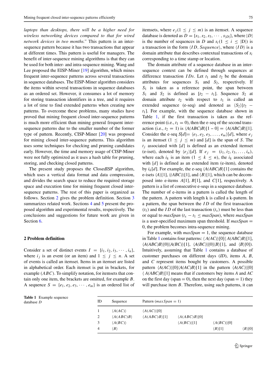 许多研究者已经修改AprioriAll用于挖掘频繁序列模式。从单个事务挖掘频繁序列被称为序列内挖掘。序列内挖掘独立地对待序列,因此,在单个序列中所有的模式是有限的。在实践中,在不同时间发生许多交易的序列是有意义的,因为事件可能会影响后续的事件。序列内挖掘已经延伸到交易间挖掘。虽然事务间的挖掘可以发生在几个交易项集,但是事务中的项目之间的顺序关系不考虑,即项目被视为一个无序的。相比之下,目前的论文研究大量交易和它们之间的关系。例如,认为一家电脑设备公司有如下模式:“如果顾客比台式机买更多的笔记本电脑,和有线网络设备相比无线网络设备在两个月内将会有更高的需求无线网络设备更高的需要。这种模式是一个序列间模式,因为它在不同的时间出现两笔交易。这种模式对管理者有用。序列间挖掘算法的好处是,它们可以同时用于序列间和序列内挖掘。王和李推荐在一些序列数据库中的交易挖掘频繁序列间模式采用EISP-Miner [19]算法。该EISP-Miner算法认为一些序列数据库中的交易组成的项集是序列集。然而,它需要消耗大量的内存用于在树上存储事务标识符,它需要大量的时间在创建新的模式时,发现长期模式。为了克服这些问题,许多研究已经证明,闭频繁序列间模式比一般频繁间序列模式更高效是由于前者的模式类型数目更小。近日,CISP-Miner [20]提出了挖掘闭序列间的模式。该算法采用一些技巧用于早期检查和修剪候选人。然而,CISP-Miner的时间和内存使用情况没有得到充分的优化,因为它使用一个哈希表剪枝,存储和检查闭合模式。